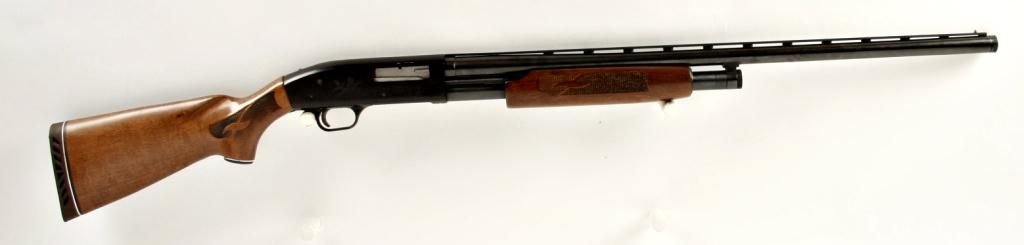 Mossberg Mdl 880 12 ga SN:H399058Pump action shotgun with 28" vent rib barrel, blued finish with checkered pistol grip stock and pump handle, removable choke, safety latch is broke and needs to be replaced before shooting, good bore andaction. Condition: Good needing repair.