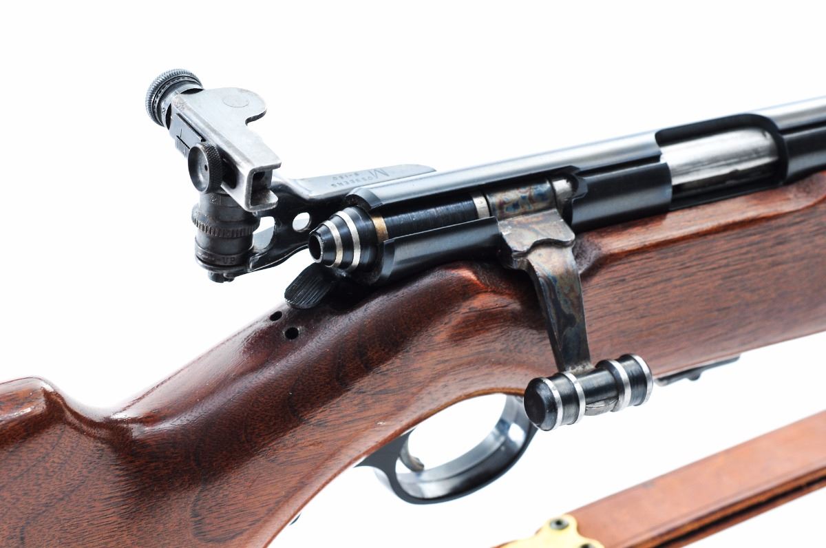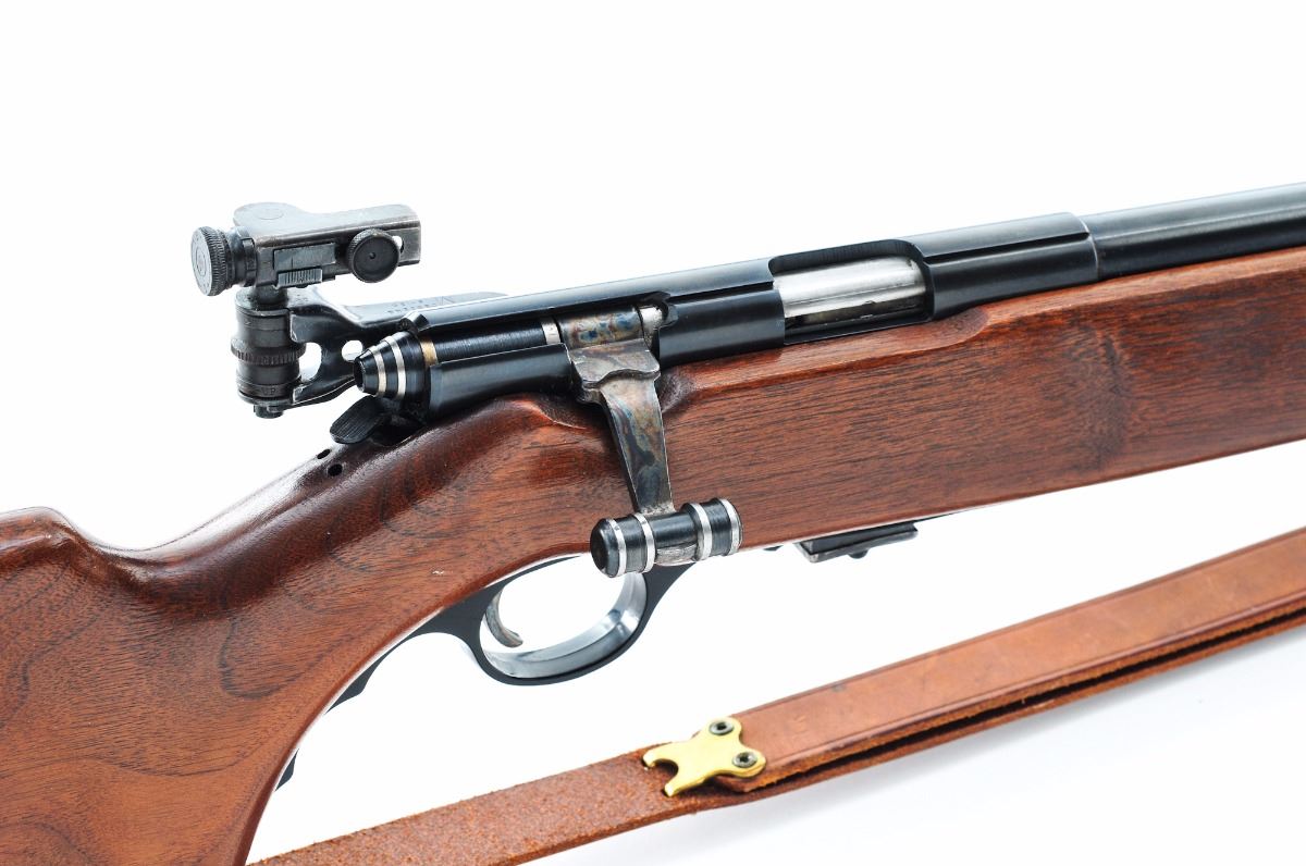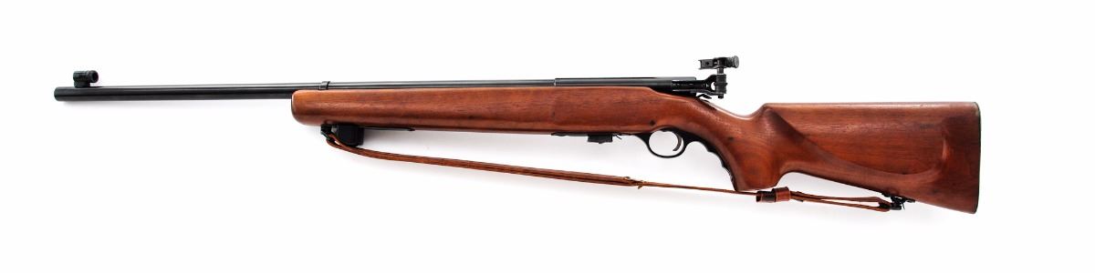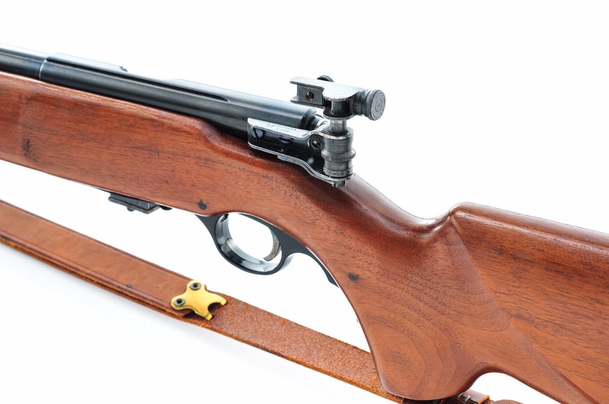 Mossberg Model 144 Bolt Action Target Rifle, NVSN, .22 LR cal., 26'' heavy barrel, blue finish, case hardened trigger and T-shaped bolt handle, pistol-grip walnut target stock, fingergroove black plastic triggerguard, with globe front sight, Mossberg S-130 rear aperture sight, adjustable sling swivels with brown leather sling, and one magazine.  Condition of metal surfaces is fine retaining approx. 96%-97% blue.  Stock is very good with scattered moderate impressions and marks from handling, as well as darkening near the buttplate and an approx. 2'' long hairline crack to left side just below aperture sight.  Action and bore are excellent.  Est.:  $200-$400.  (C&R)