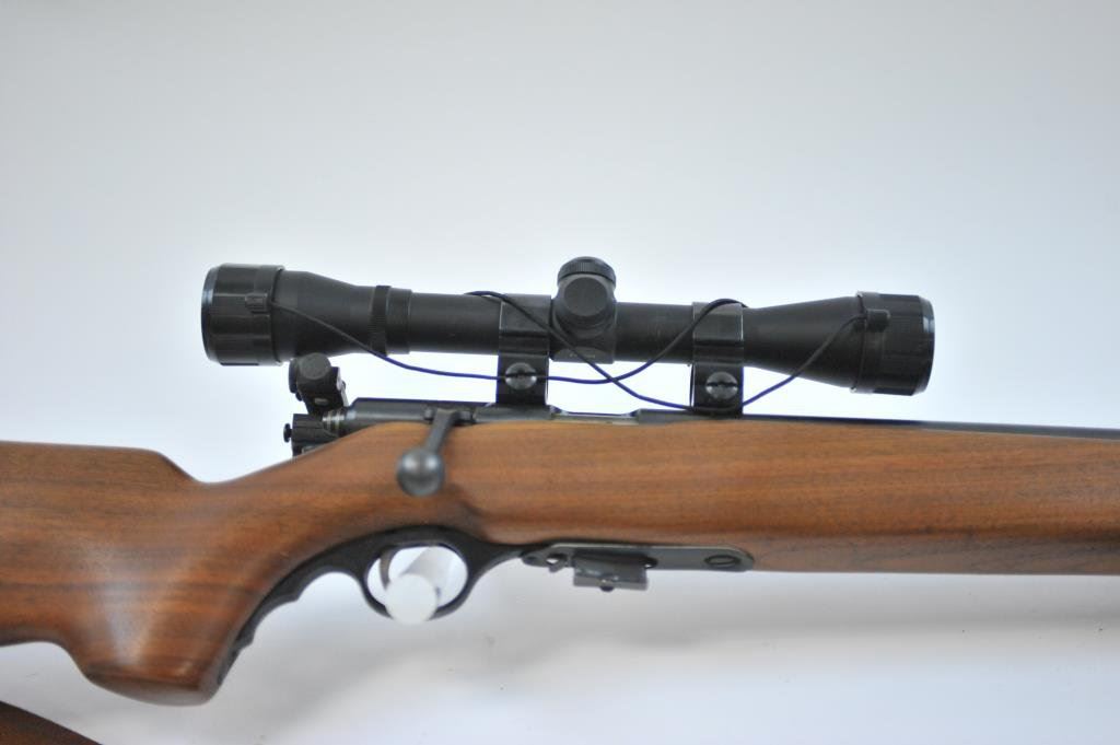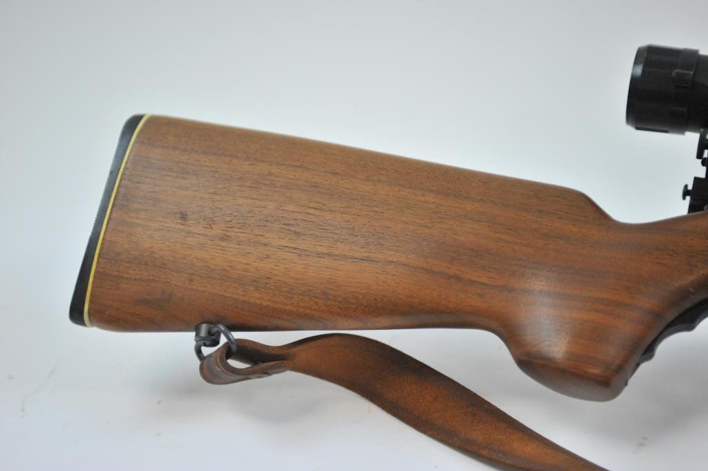 591595. Heavy round 26” barrel, adjustable front swivel, Mossberg tang and target front sight. Simmons scope on weaver mounts in factory grooves. Fine to excellent overall. 97%-99%. The wood is also about fine. Est.: $250-$500
