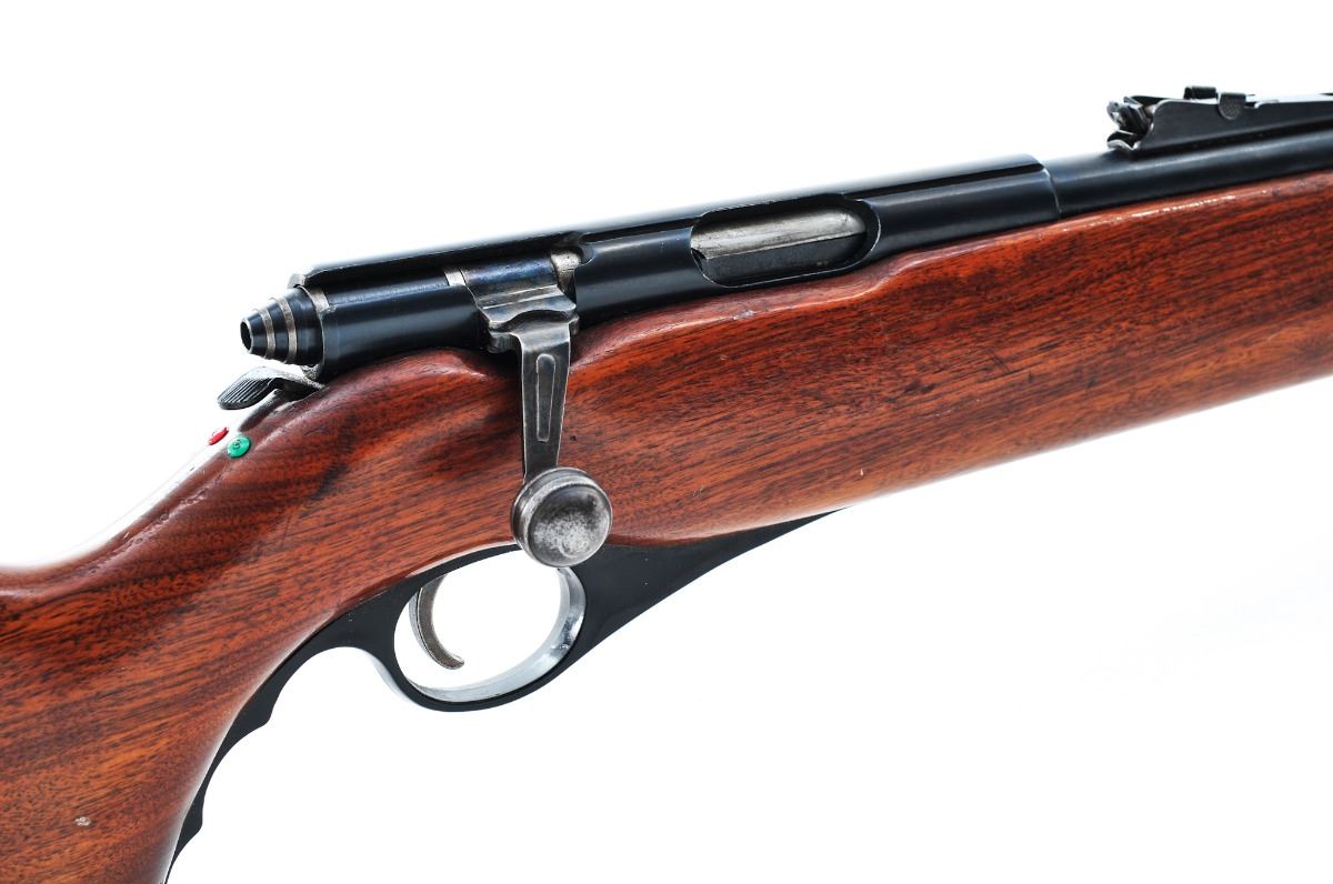 Mossberg Model 146B Bolt Action Rifle, NVSN, .22 S-LR cal., 26'' barrel, blue finish, pistol-grip hardwood stock with cheekpiece, fingergroove triggerguard, black plastic recoil pad, with large blade front sight; only the adjustable rear sight base is present. Condition is very good retaining approx. 97% blue. Stock with general dings and mars, as well as a repair at the toe. Action and bore are excellent; bore with sharp rifling. Est.: $150-$250. (C&R)