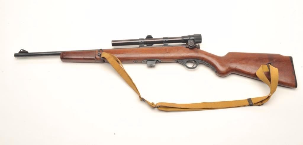 Mossberg Model 152 bolt action rifle, .22 Long Rifle caliber, serial #NSNV. The rifle is in good overall condition with an 18” barrel. The barrel retains a significant amount of its blued finish with some lightsurface rust and muzzle wear. The action is also freckled with light rust but otherwise shows the majority of its blued finish. The smooth wood stocks are in good condition with mars and dents from field use. The fore end is cantilevered to serve as a pistol grip while the butt ends with a hard plastic butt plate. The rifle is topped with a Weaver V-22A 3 x 6 variable power scope. The bore is fair, the action works and the markingsare legible. Est.: $100-$200. (Modern).