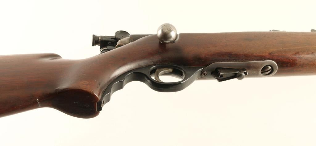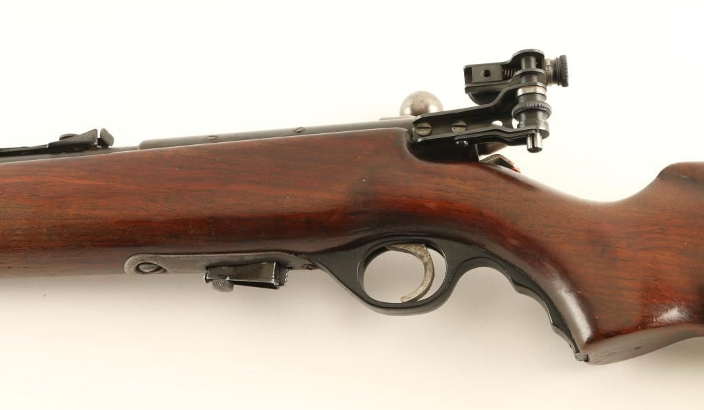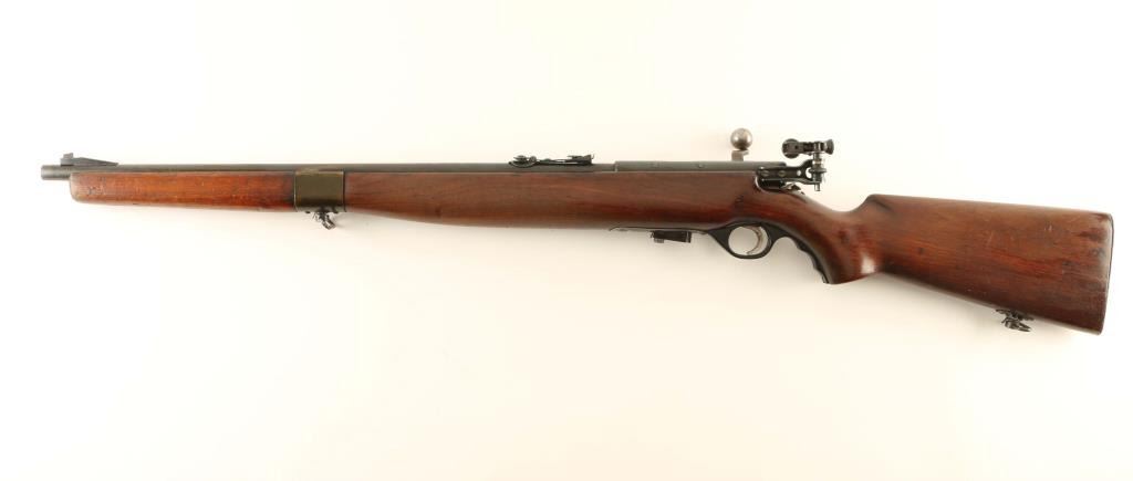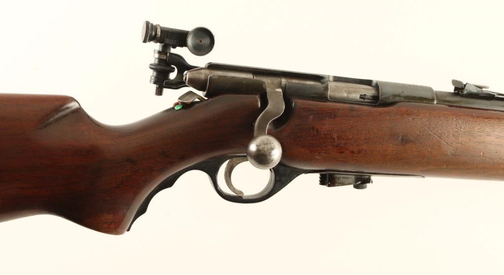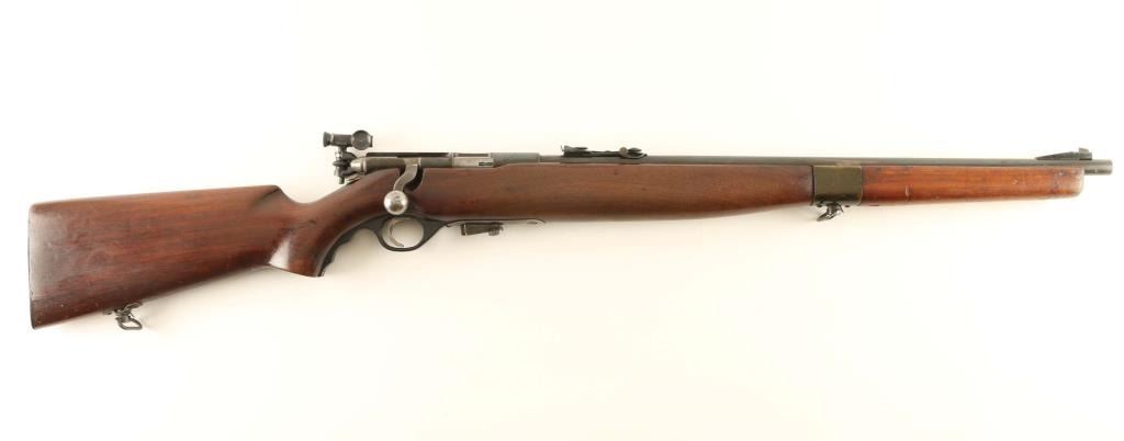 WWII era British military magazine fed bolt action training rifle chambered in .22 Long Rifle. Manufactured in the United States by Mossberg for the war effort via the lend-lease program circa 1942-1943. Features a blued finish, 23” barrel, ramped patridge front sight, fully-adjustable rear sporting sight, receiver mounted Mossberg Microclick S-100 adjustable aperture sight, serrated trigger, synthetic trigger guard with finger grooves, cocked indicator on the rear of the bolt, manual safety on the rear of the receiver, case hardened bent bolt handle with round knob, detachable 7 round magazine with removable 1 round limiter, quick-detach sling swivels and two-piece full length smooth walnut semi-pistol grip stock with serrated trapdoor metal buttplate. The barrel and receiver are both marked “UNITED STATES/PROPERTY/SERIAL NO. 11529” and the barrel is also stamped “M.192/1943” with various Birmingham nitro proof marks. Rifle retains approximately 70% of its original blued finish showing edge wear and thinning with a small amount of surface rust near the muzzle. Action is sound, the bore is excellent and the wood stocks are good showing wear & blemishes. Condition is NRA Good to Very Good. ***C&R Firearm***