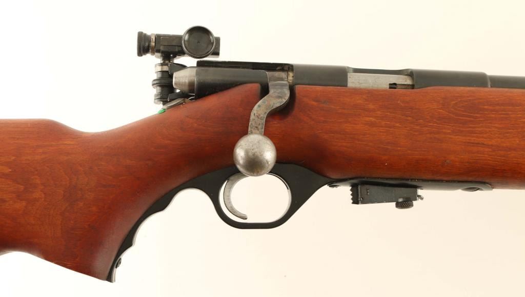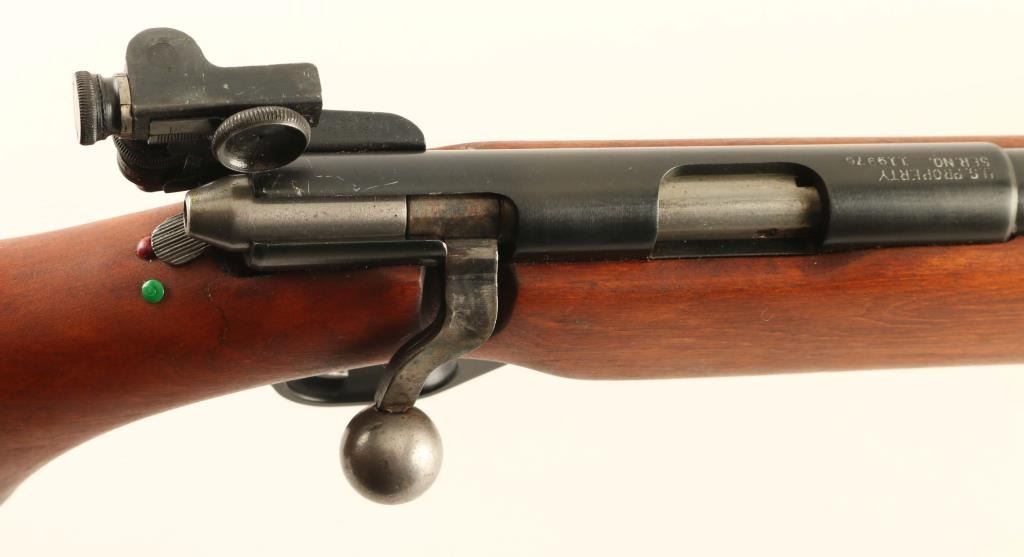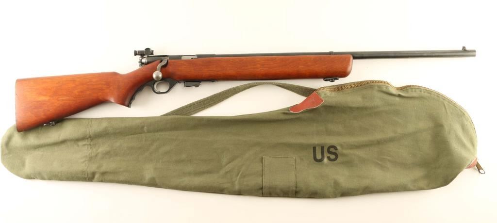 “U.S. PROPERTY" Marked magazine fed bolt action training rifle chambered in .22 Long Rifle, manufactured in New Haven, CT circa 1943-1949. Features a blued finish, 26" medium-contour round barrel, dovetailed blade front sight, receiver mounted Mossberg Microclick S-100 adjustable aperture sight, serrated trigger, synthetic trigger guard with finger grooves, cocked indicator on the rear of the bolt, manual safety on the rear of the receiver, case hardened bent bolt handle with round knob, detachable 7 round magazine with removable 1 round limiter, and smooth semi-pistol grip birch shoulder stock with sling swivels & serrated metal buttplate. Includes a “US” marked green rifle cover. Rifle retains approximately 90% of its blued finish showing wear and some scattered pitting on the barrel towards the muzzle. Action is sound, the bore is pristine, the markings are very good and the wood stock is very good with some dings & scratches. Condition is NRA Very Good. ***C&R Firearm***
