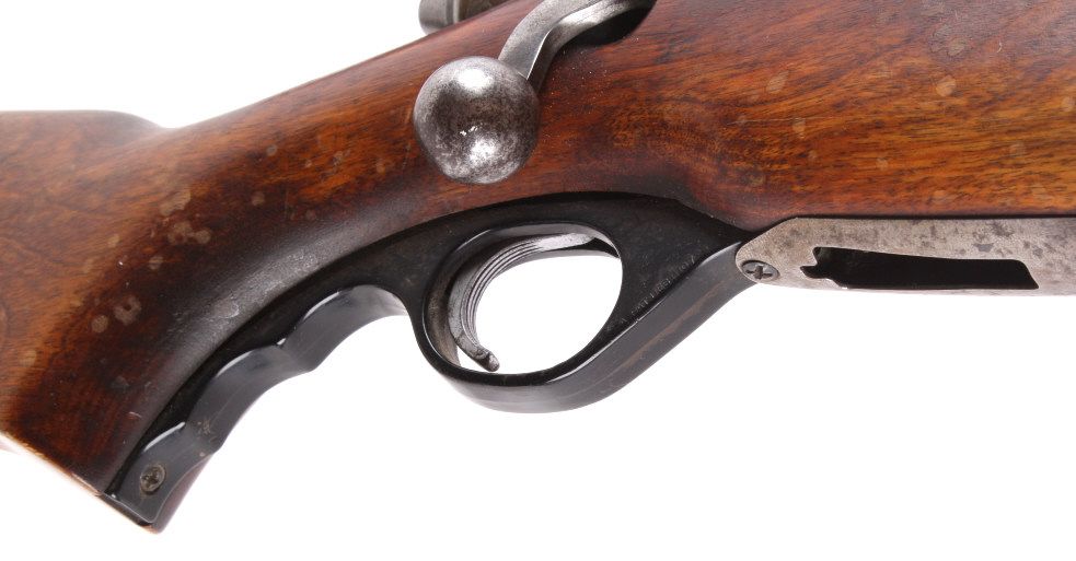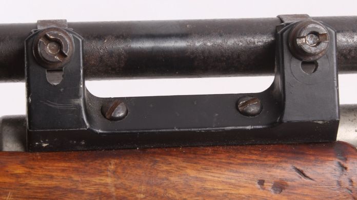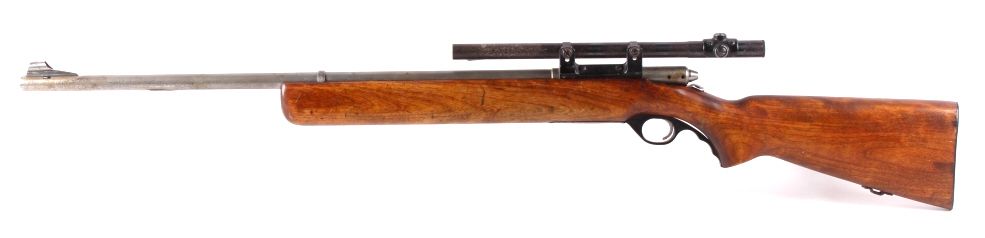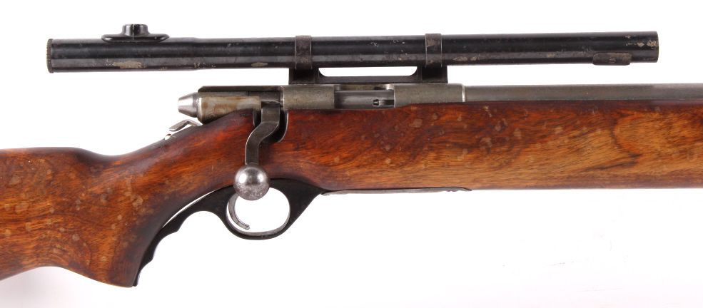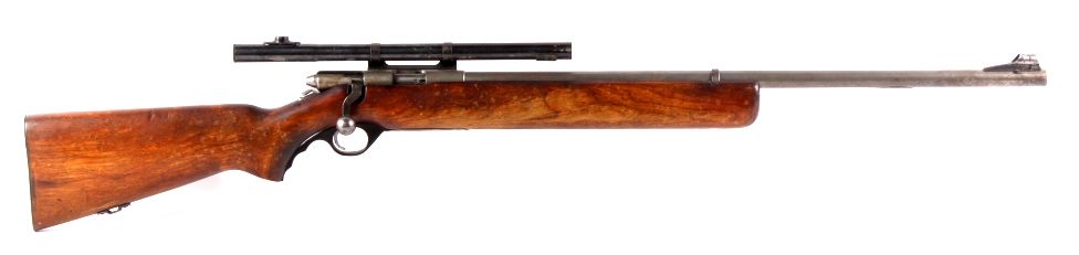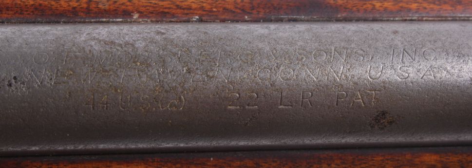 This is a O.F. Mossberg & Sons Model 44 U.S. bolt action rifle in .22 long rifle caliber. This rifle has a bull barrel and was used my the United States military from 1944-1949 under Government Contract. The rifle is very accurate. This has an early Weaver scope and is a desirable collectible .22 rifle. The gun shows wear, but is overall a great piece. No Serial Number. Rare front hoop sight believed to be Lyman.