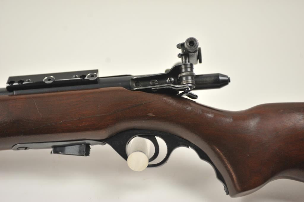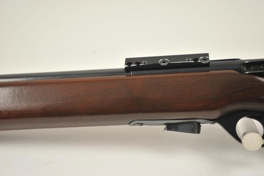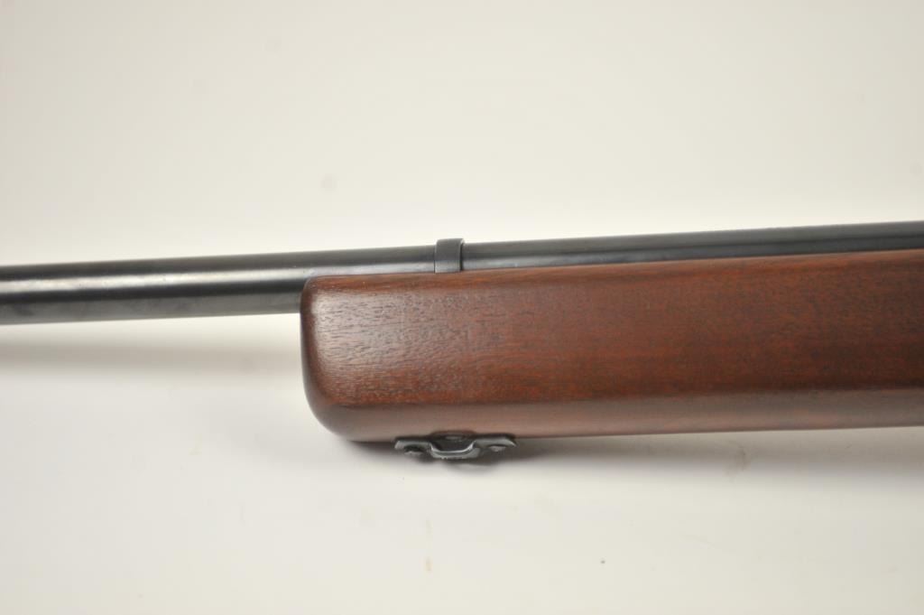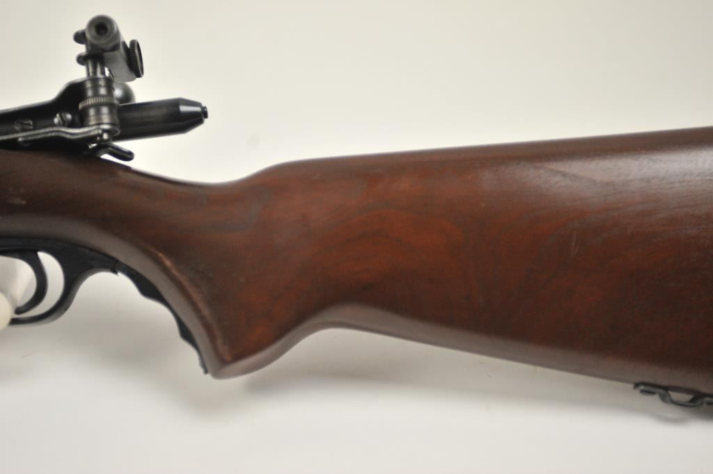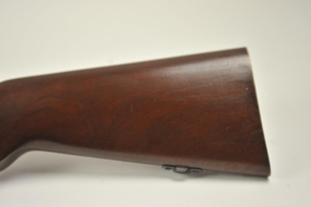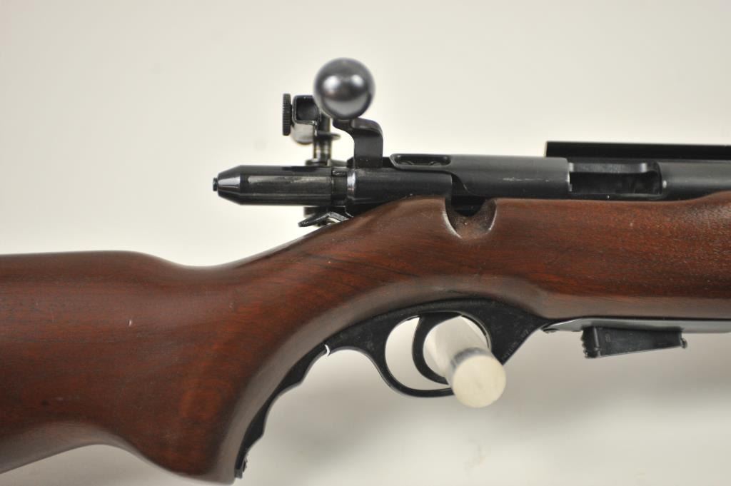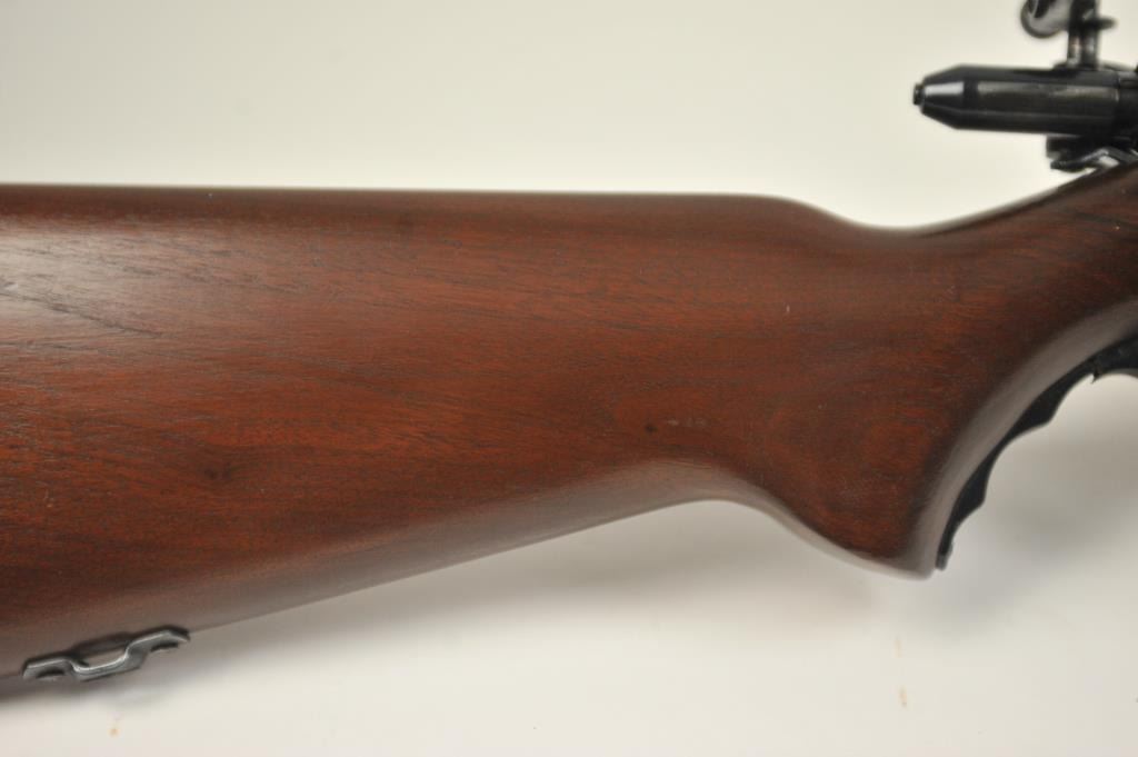 Mossberg Model 44US (b) bolt action target rifle, .22 Long Rifle caliber, Serial #NSNV. The rifle is in fine overall condition with a 26” barrel retaining most of the original blue finish with wear at the muzzle and light scratches. The rifle has a flip up front sight and a Mossberg S-130 aperture sight added. A side mount scope base has been added during the period of use. The smooth wood target stock is in very good conditionwith an oversize froe end and a checkered steel butt plate. The bore is good and the action is crisp. The lot includes one correct magazine. Est.: $175-$350. (C+R).