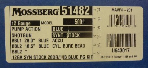 Mossberg Model 500 "3 in 1" Home Def, Hunting & Cruiser Shotgun 12 Guage. Finish-Blue, Action-Pump, Stock-Black Synthetic Checkered & Pistol Grip Kit, Capacity-2.75" 5+1, Chokes-28" Multi-Choke (F,Mod,IC) 18.5" Cylinder Bore, Chamber-3", Safety-Tang, Sights-Bead, Barrel Length-28" Vent Rib and 18.5", Overall Length-47.5" or 39", Weight-7.5 lbs or 6.75 lbs, Features-Exclusively Available from Davidson's, Butt Plate-Vented Recoil PAd, Receiver-Blue. EST. $429-475. **COMES WITH LIFETIME GUARANTEE***