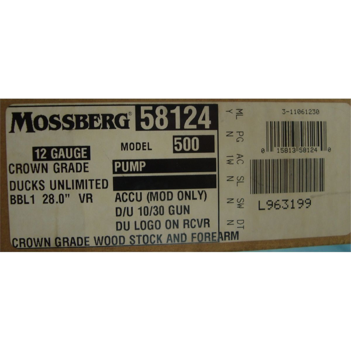 #L963199; 12 ga. w/DU logo on left side of receiver. Bbl. is ribbed. Condition is NIB.