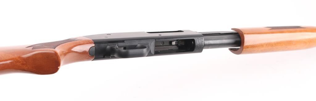 American made pump action shotgun chambered for 2.75" & 3" 20 gauge shotgun shells. It has a 18.75" round blued barrel and receiver, 3/4 length magazine tube, brass bead front sight, tang safety and smooth trigger. Wood pump handle is ribbed for better grip and the smooth shoulder stock has a vented rubber recoil pad. Metal finish is about 99% , wood is near excellent with a few minor scratches, bore is excellent/bright. LOP is 14". Choke is CYL Comes with a bag with pistol grip, manuals, and a extra 28" vent rib barrel white and brass sighting beads. NRA Condition-Near Excellent. Modern Firearm.