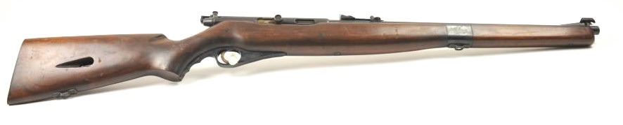 Mossberg Model 51M semi automatic target rifle, #NSNV, 22 LR. cal., 20” barrel, blued finish, adjustable sights and a Mossberg No 4 receiver sight, tubular magazine, smooth wood stock with metal butt plate. Rifle isin fair to good condition overall, 85-90% original finish retained with freckling on the barrel and receiver. The bore is good and should improve with cleaning, the action is good. The stock is good with scatteredmars and dings, and a crack at the wrist starting which is about 2” in length. (C&R/PPT) Est. $150-300