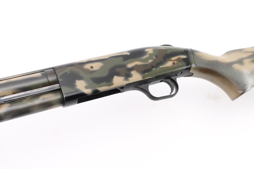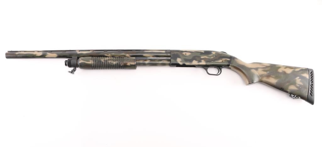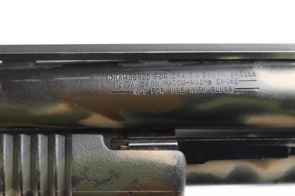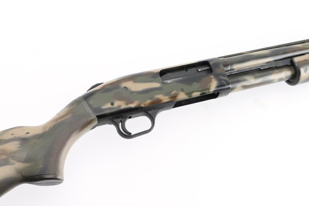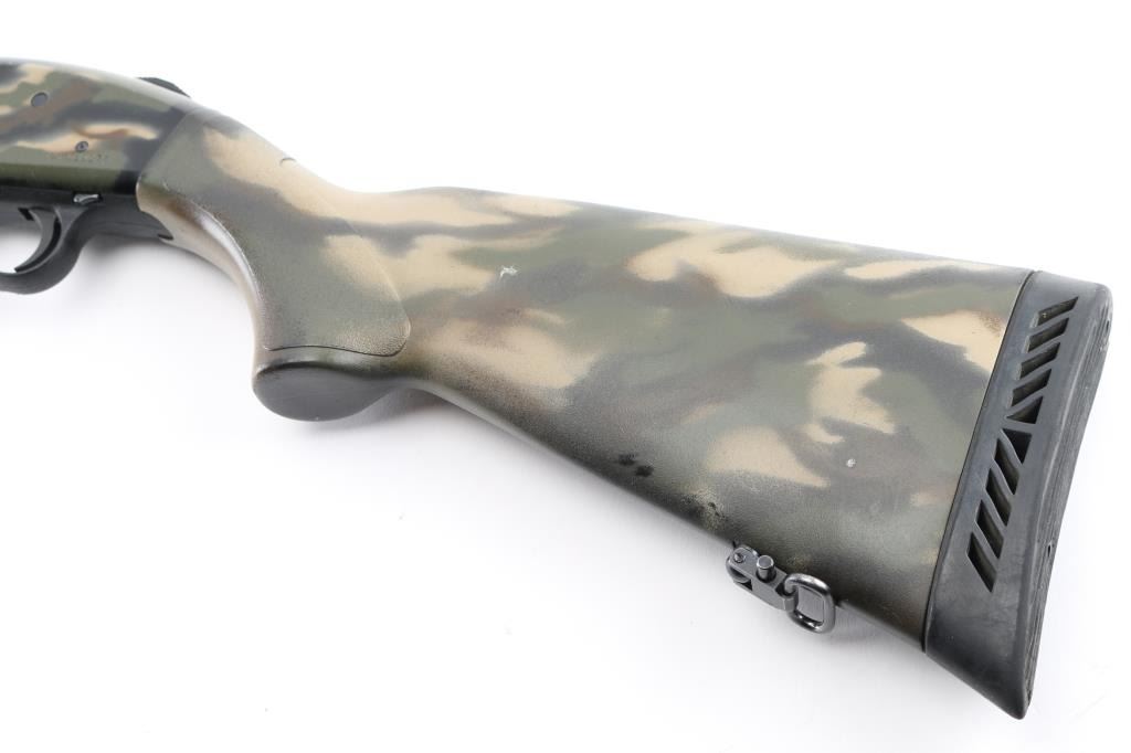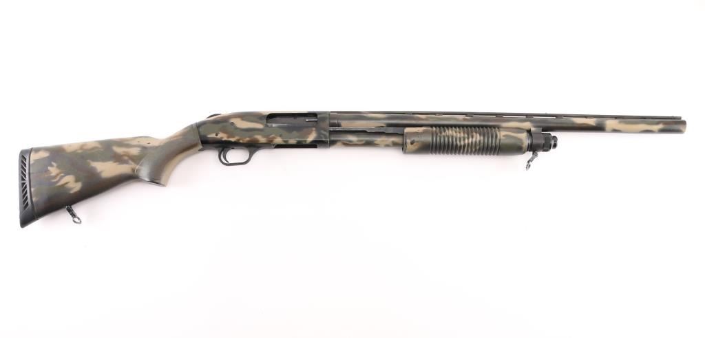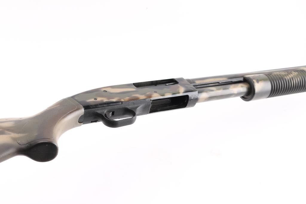 SN: UM186074. Pump action, six-shot shotgun with 24" vent rib barrel, covered with camouflage finish, Mossberg extra full turkey "lead shot only" choke installed, white bead front sight, brass bead mid sight, smooth trigger, rubber recoil pad. Chambers 2 3/4", 3," and 3.5" shotshells. Mossberg signature overbored barrels offer 10 Gauge dimensions for the entire length of the barrel. Standard features include dual extractors, steel-to-steel lockup, top-mounted ambidextrous tang safety, twin action bars, and anti-jam elevator. Receiver drilled/tapped for optics. Includes Accu-Mag choke, Mod-T&F Steel, IC All lead. Accu-Mag choke Mod-2&BB Steel, all lead, 3 choke wrenches, and a 3" barrel extension with muzzle break. LOP is 14", Action is smooth, bore is excellent/bright, finish has some minor scratches/rubs. NRA Condition-Very Good. Modern Firearm.
