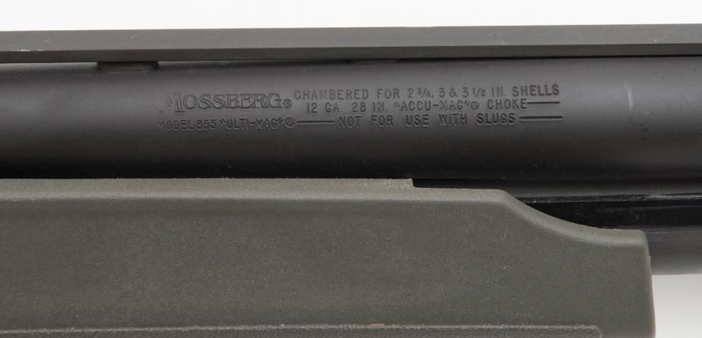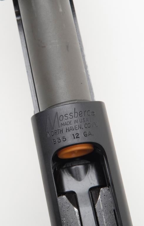 Mossberg Model 835 pump action shotgun, 12 gauge, 28” ventilated rib barrel, mat finish, synthetic stocks, #UM 351767 in overall fine condition showing the majority of its original finish with some minor storage mars; fine bore, action,markings and stocks. (Modern). Est.: $175-$350.