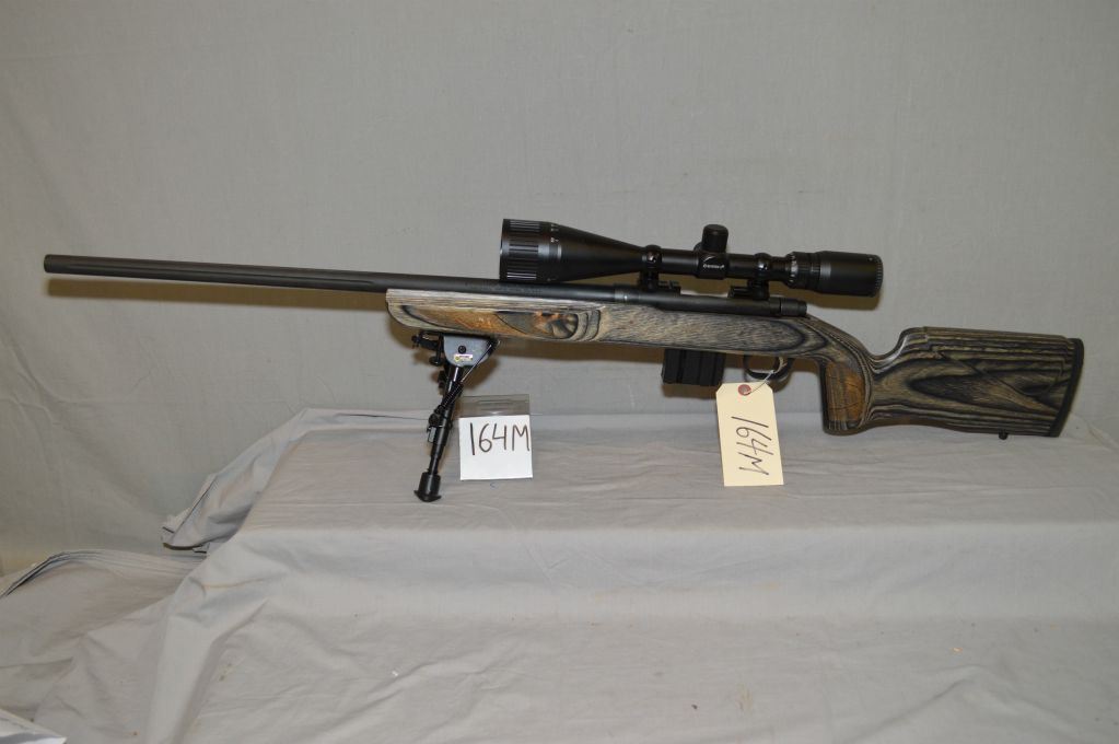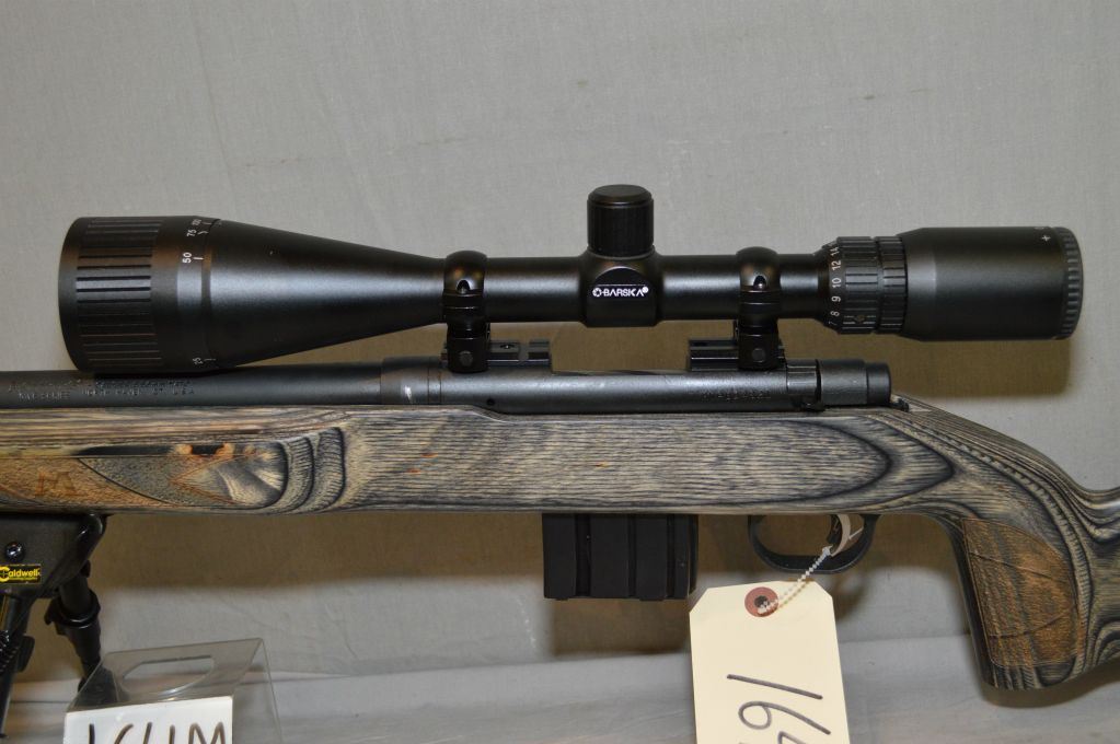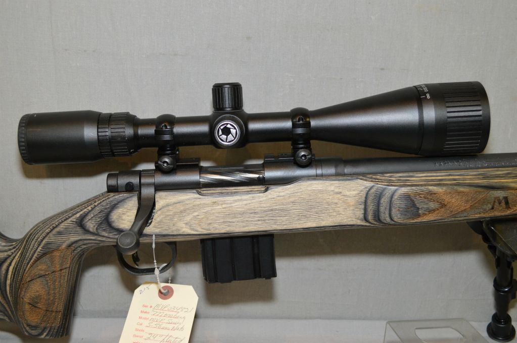 Mossberg Model MVP Series .5.56 MM Nato cal Mag Fed Bolt Action Rifle w/ 24" fluted bbl [ also has fluted bolt, no sights but fitted w/ BARSKA 4 - 16 Variable scope w/adustable objective, black & grey lamintated large swollen pistol grip stock, w/ high comb, w/ Caldwell Shooting Supplies bipod, Mossberg recoil pad ] Ser # MVP 034821