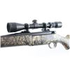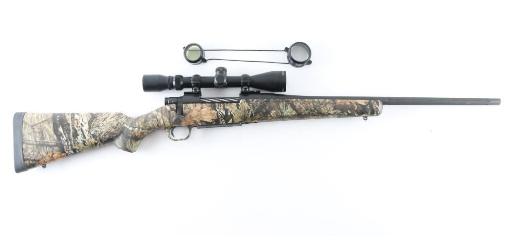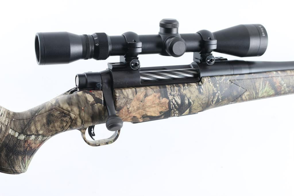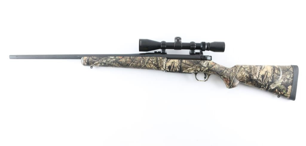 This is a modern bolt action rifle chambered in .30-06 Win. It has a 22" matte blued, partially fluted barrel and receiver. No provisions for sights, The fluted bolt is a nice touch. Manual safety, The synthetic stock is Mossy Oak "Break Up" camo. black rubber recoil pad.. The stock isn't checkered but does have textured surfaces for better grip at the wrist and forend. It comes with swivel studs installed and has a removable box magazine. Mounted with a 3-9x40 scope, no maker, clear optics. Bore appears excellent/bright. Action is smooth/tight. Stock. and metal finish are excellent. Almost new condition. NRA condition-Excellent. Modern Firearm.