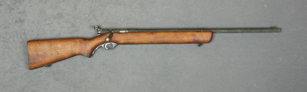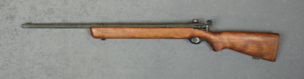 Mossberg U.S. Property marked single shot training rifle, .22LR cal., 26” barrel, parkerized finish, target half stock with sling swivels, #101751. This gun is in overall uncleaned very good condition showing considerable parkerized finish on metal surfaces, adjustable rear peep sight, very good bore, crisp action, very good markings, very good wood stock; would improve greatly with a careful cleaning and TLC. Est.:$150-$300.