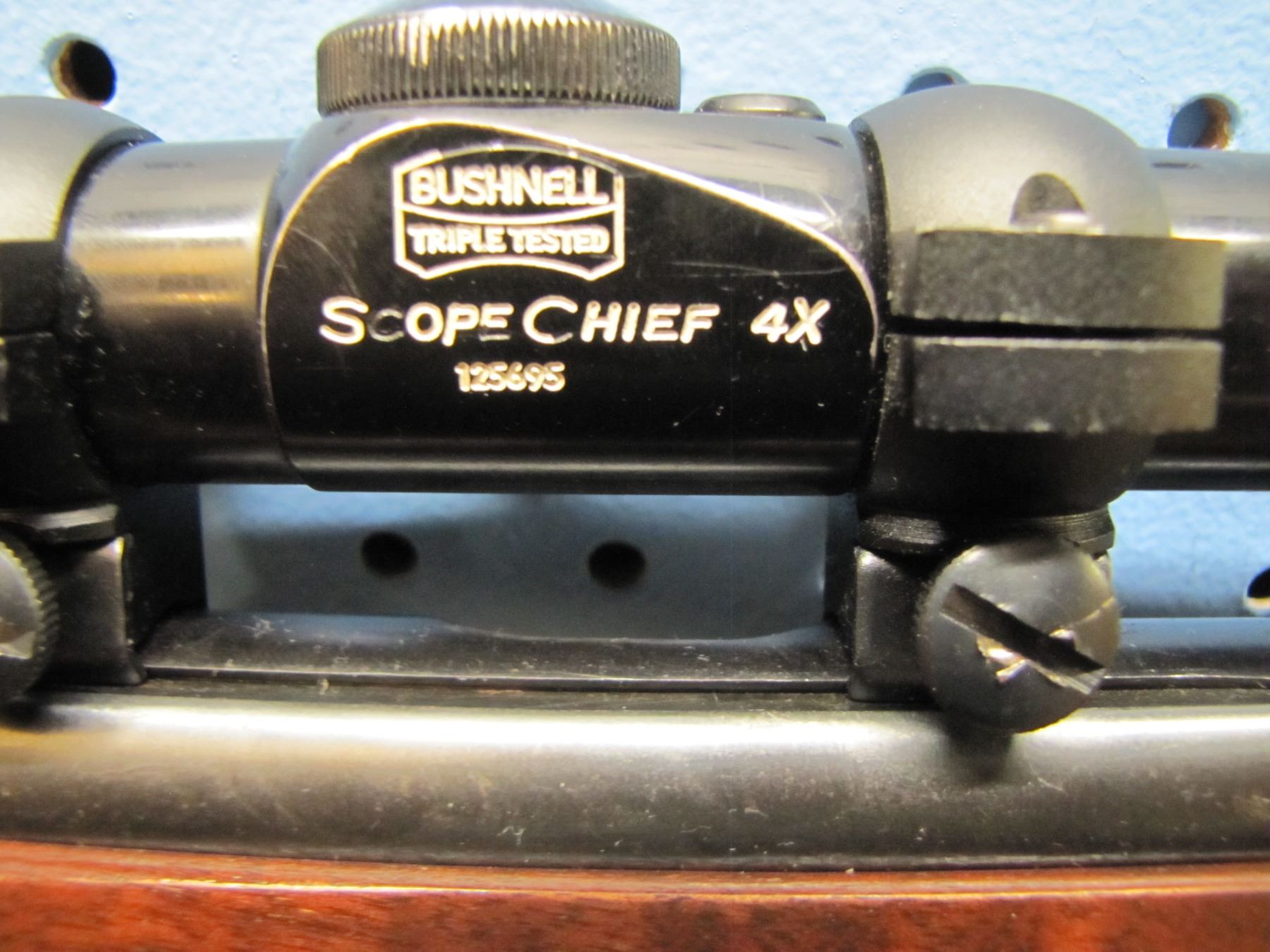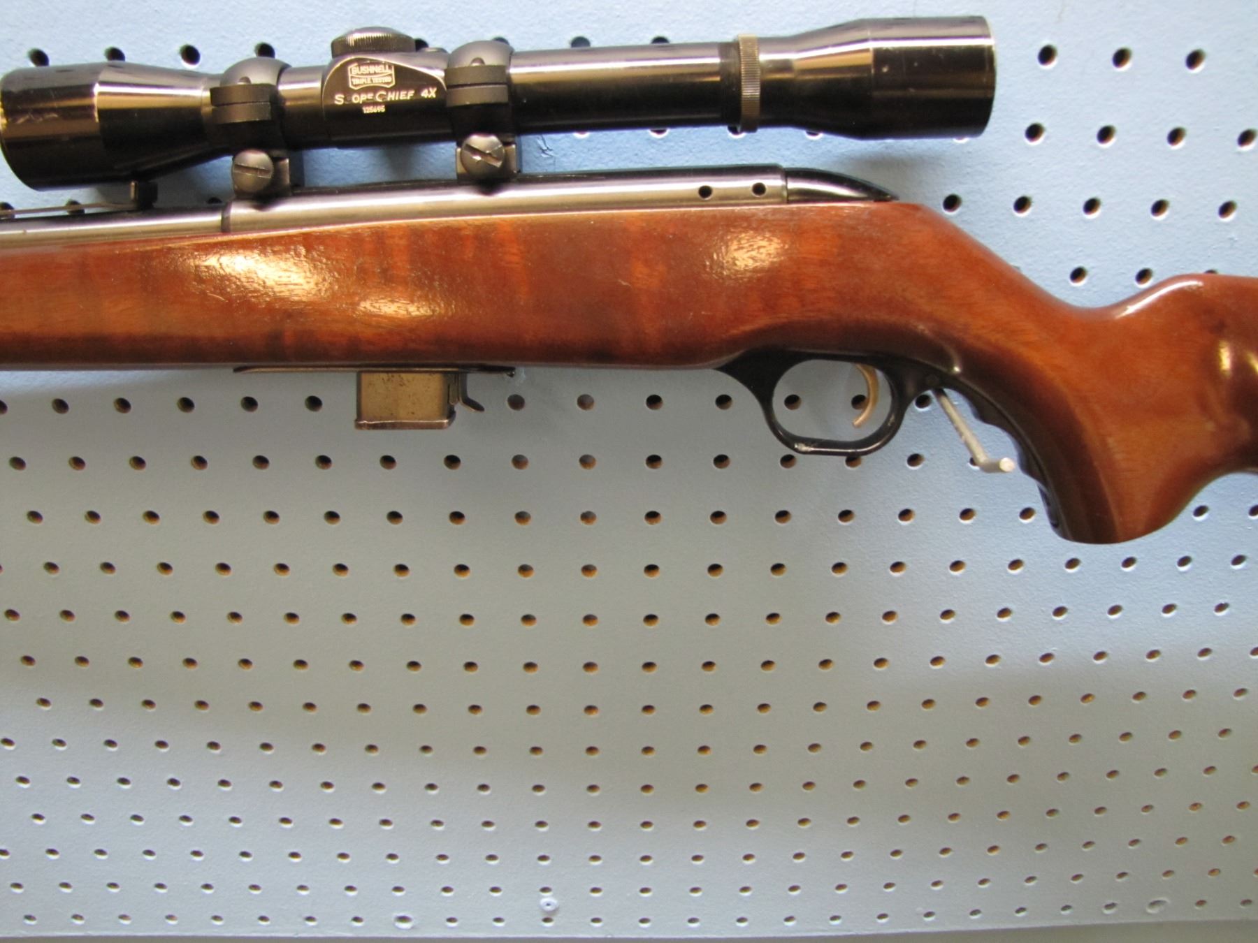 Mossberg model 340 BA; bolt action; .22 S/L/LR; clip; Bushnell Scope Chief 4 Power scope; S/N unknown
