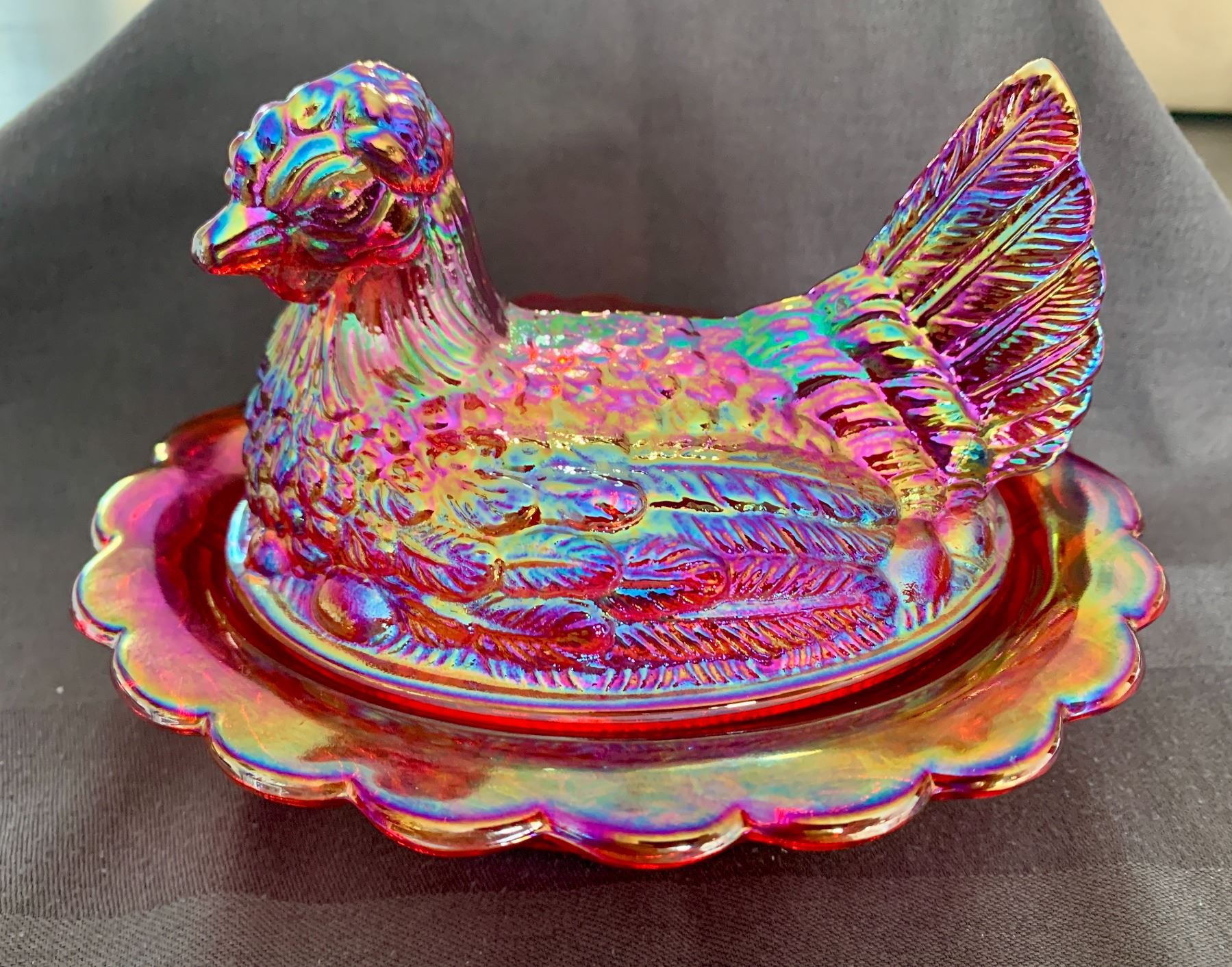 Mosser Red Carnival Glass Hen on Nest 6 1/2" L x 5 1/2" W x 4 3/4" Tall
