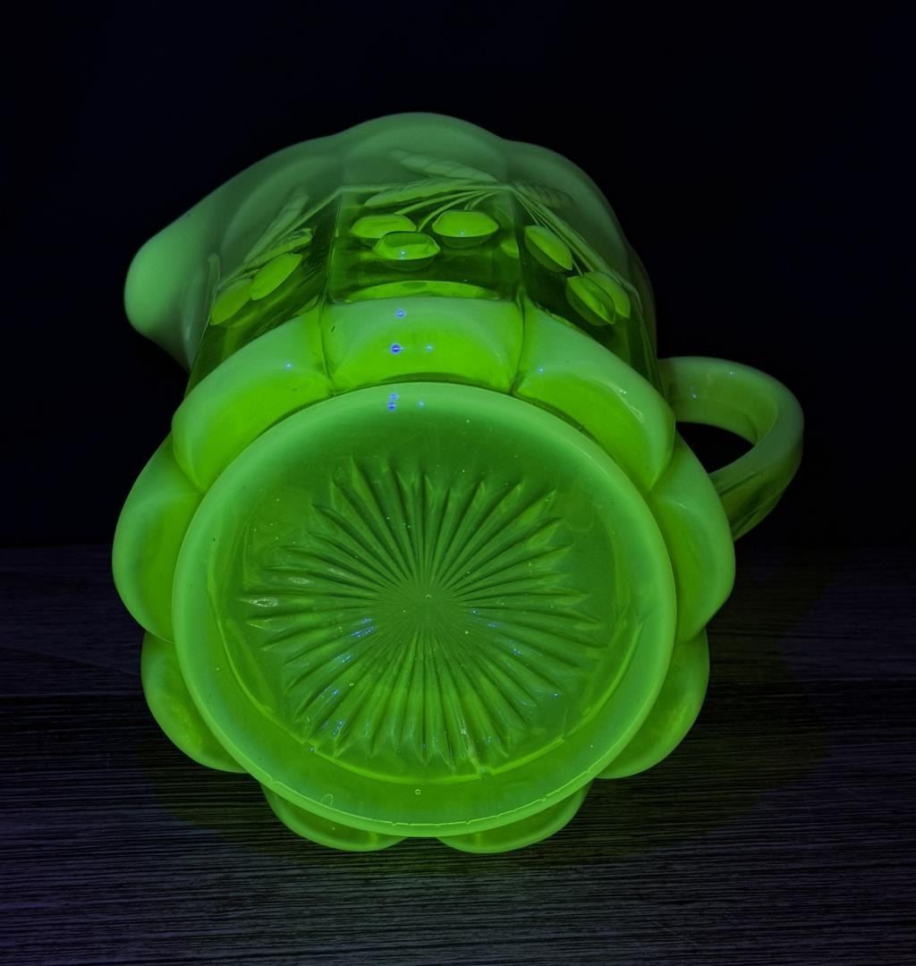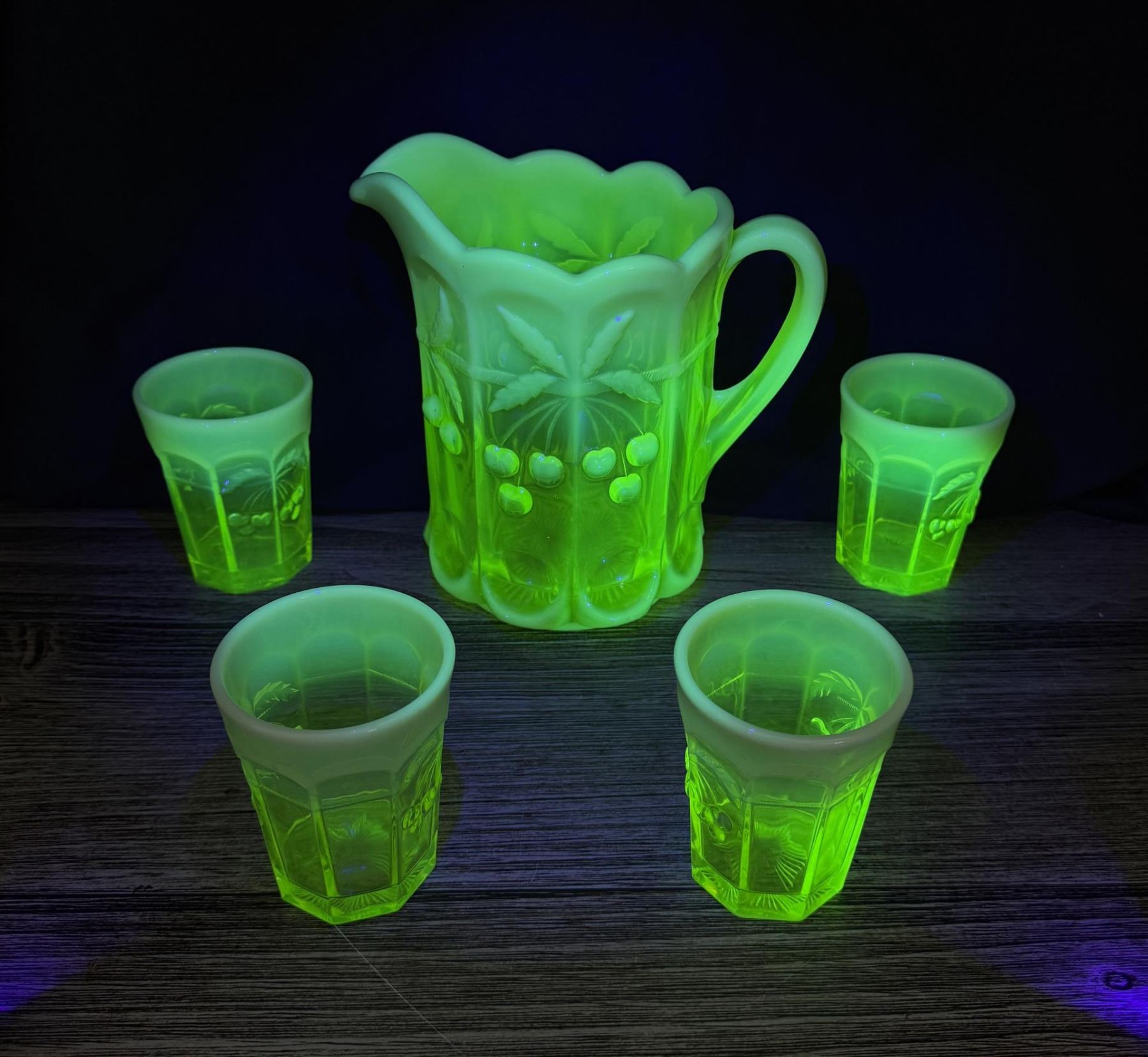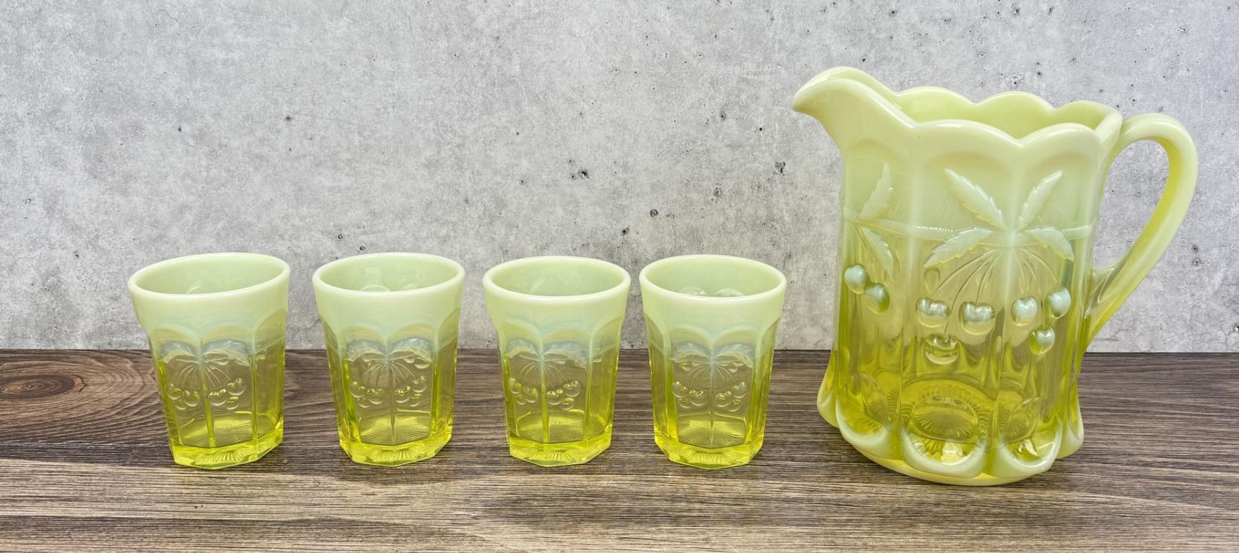 Pitcher measures 8 1/8" by 6 3/8" by 6 1/8". Glasses measure 4" by 3 1/8" by 3 1/8". Cherry Cable Pattern.