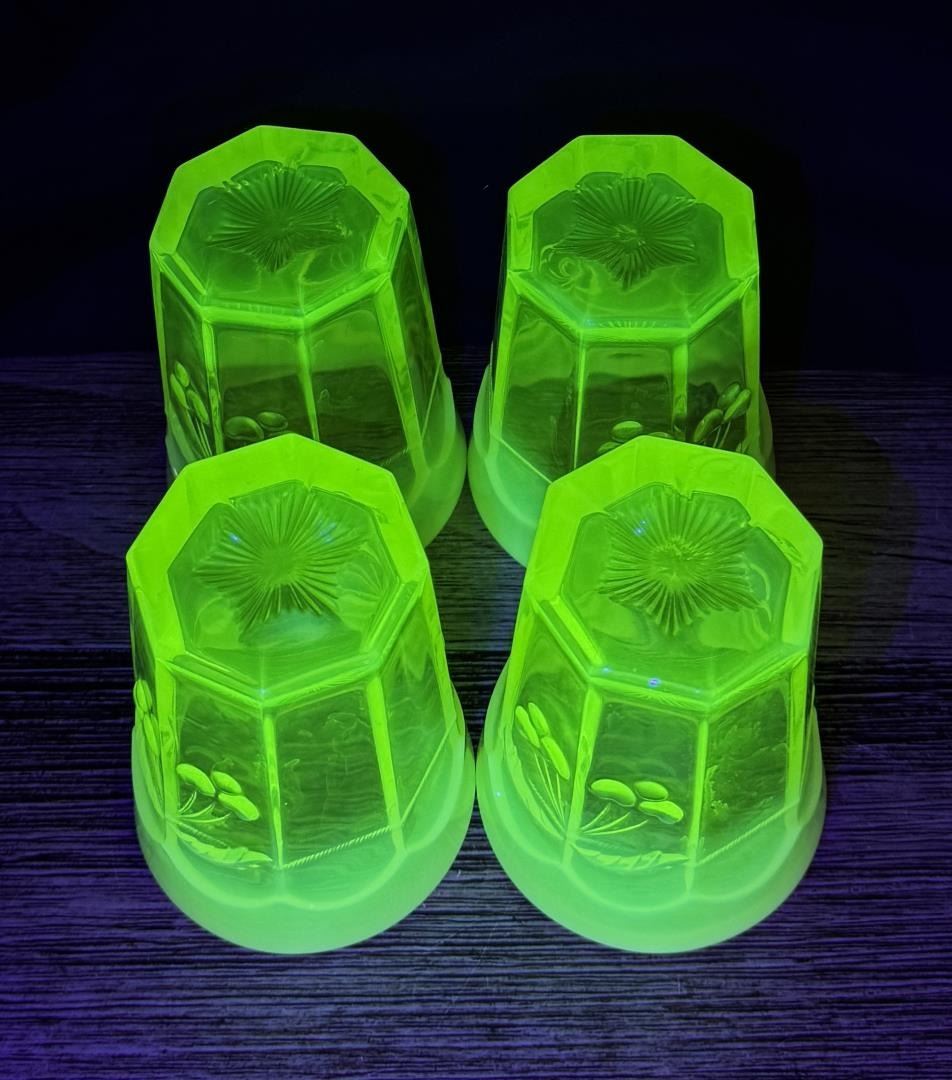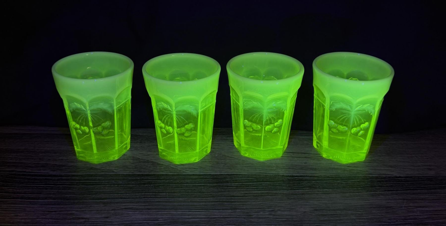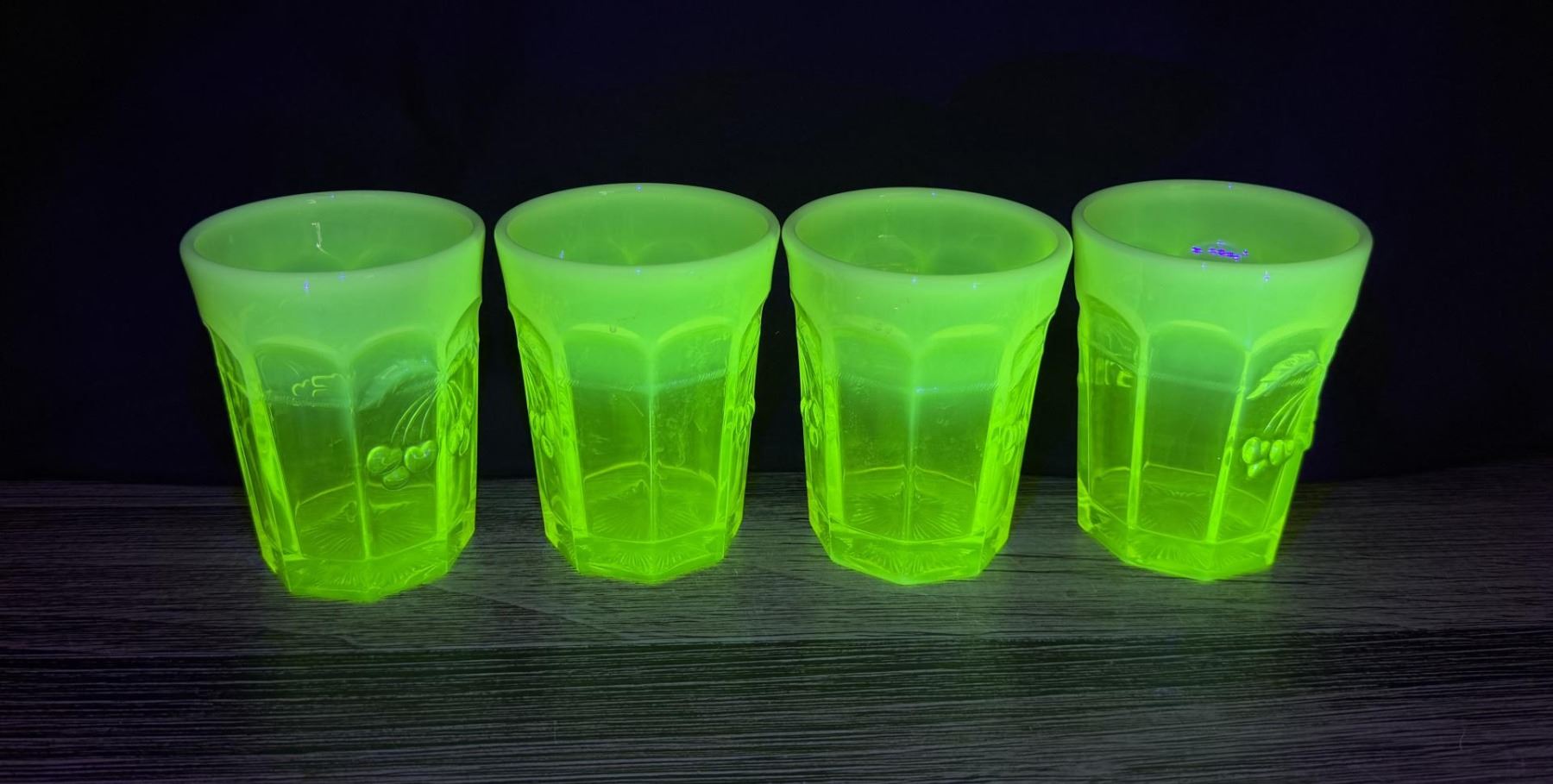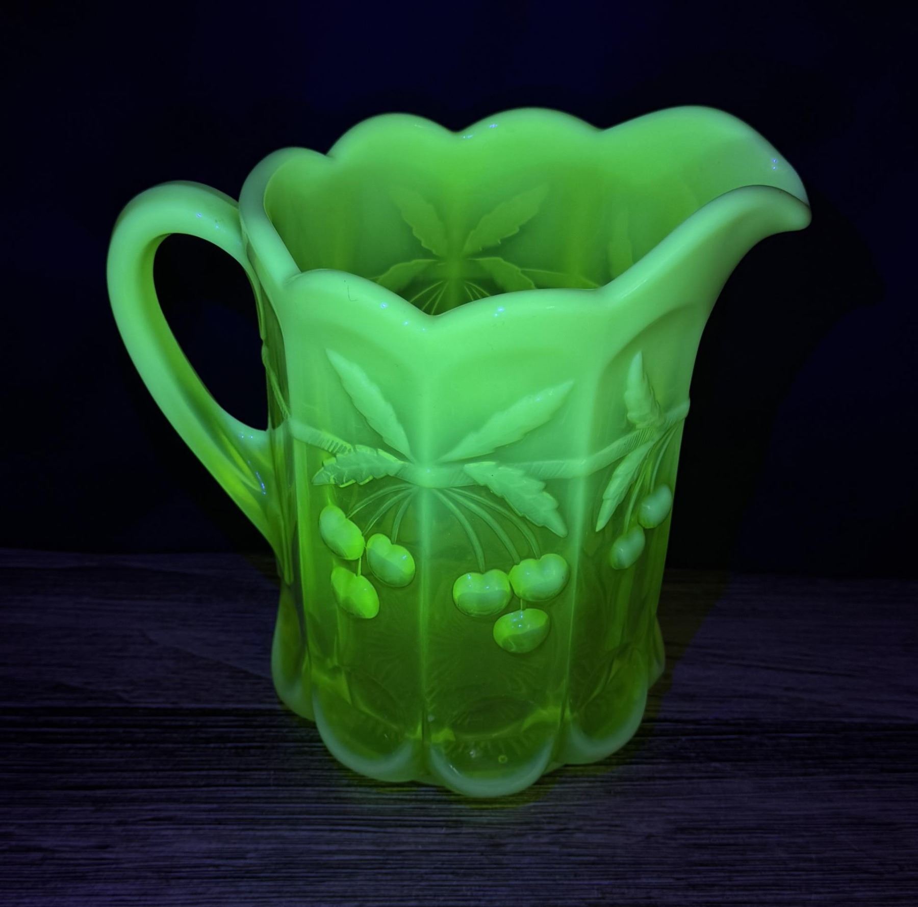 Pitcher measures 8 1/8" by 6 3/8" by 6 1/8". Glasses measure 4" by 3 1/8" by 3 1/8". Cherry Cable Pattern.