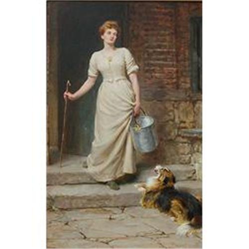 Signed and dated 1894. Briton Riviere was an English painter; the surname indicates his descent from a Huguenot family which settled in England in the 17th Century. The family included several painters, and so Briton Riviere was introduced to art at a young age. He studied drawing and painting at Oxford, where, incidentally, his father William Riviere had persuaded the University to introduce the study of art for undergraduates. Though he exhibited at the Royal Academy from 1858, Riviere's first real success came only in 1869, with his picture The Long Sleep, showing an old man dead in his chair, watched by his two dogs. This sort of picture was ideally suited to attract the Victorian art lover, and Prisoners (1869) and Charity (1870) were also gloomy enough to win high praise. He began to exhibit Classical paintings from 1871, with Circe and the Friends of Ulysses producing an instant success: