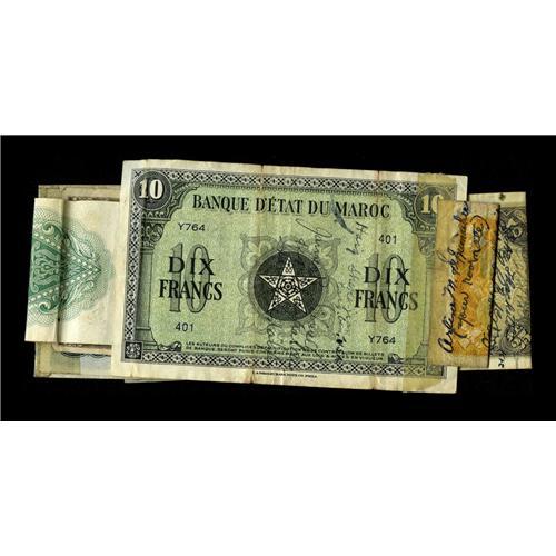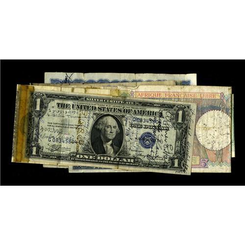 <B>Most Interesting Short Snorter.</B></I><BR>Ten World War Two era notes comprise this Short Snorter. The back of the $1 North Africa note has the autographs of Clark Gable and Irving Berlin. This Philippines Pick 109a was signed by Japanese General Tomoyuki Yamashita commander of Japanese ground forces in the Philippines. He was captured in September 1945 and stood trial for war crimes. It was at this time that the general and the Short Snorter owner paths crossed. Yamashita was found guilty and executed on February 23, 1946. A penned line to this effect has been written on the back of the P-109a. Also, a more detailed account of the acquiring of the three important signatures on this Short Snorter is included with this lot.<BR><BR><b>Shipping:</b> Coin/Currency (<a target="_blank" href="http://www.heritageauctions.com/common/shipping.php">view shipping information</a>)