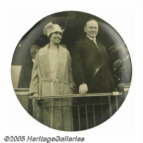 <B>Most Unusual 3 1/2" Celluloid Paperweight Mirror with Calvin Coolidge and Grace Coolidge</B></I> By a wide margin the best item we have ever seen for this pair, and almost surely the only one in the hobby! Made like a celluloid button with a mirror insert in the back, but different from a pocket mirror in size and because a heavy weight has been added to the interior construction so it can be used as a paperweight. Beautiful condition but for a couple of long fine celluloid cracks, which would not be hard to live with considering the probably unique nature of this item. Lot:262