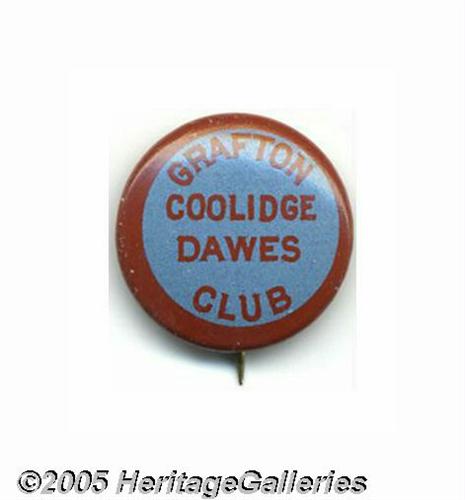 <B>Most Unusual Local-issue Coolidge Pin</B></I> While this 3/4" litho variety is listed by Hake, we certainly have never handled an example. Mint condition so unusual in a litho. Lot:262