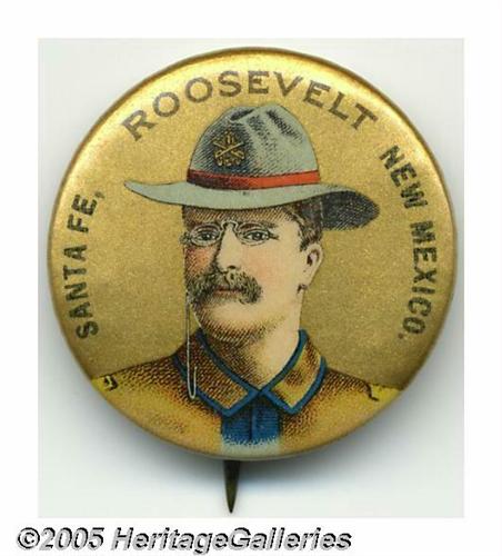 <B>Most Unusual Teddy Roosevelt Item From New Mexico</B></I> New Mexico was still a territory when this colorful 1 1/4" beauty was issued! This is a familiar design seen in various forms, but it is always a collector favorite because of the Rough Rider garb and striking coloration. We cannot recall seeing this New Mexico variety before, however, and it surely is the most desirable of the genre. Mint condition. Lot:261