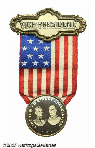<B>Most Unusual William McKinley Badge with Abraham Lincoln</B></I> We are all familiar with the 1 1/2" 1900 button design picturing McKinley with Lincoln, but this version is quite unusual. It was a very common practice during this era to name local Republican groups after Party heroes, however, particularly Lincoln and James Blaine, and even John Fremont (the first Republican Presidential candidate). Interestingly, U. S. Grant seems to have been ignored, probably indicating that his name had not been rehabilitated from the scandals which plagued his administration. This striking badge features a 1 3/4" convex celluloid, and is in absolutely mint condition. Overall 3" x 5". Lot:260