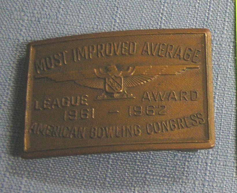 High quality solid brass most improved average bowling award belt buckle from the American bowling congress est. value $65.00-$75.00
