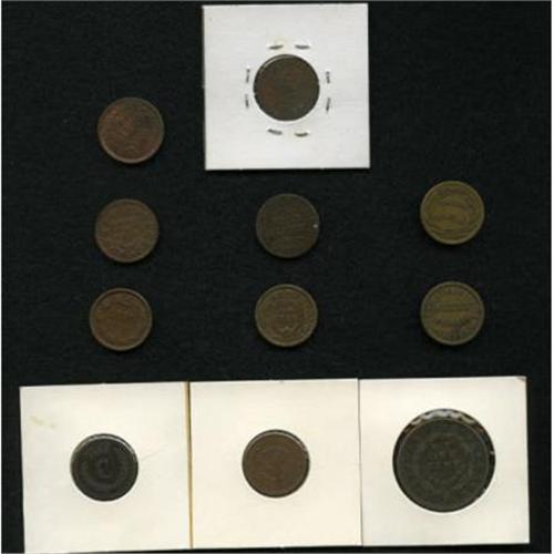 <B>Mostly Civil War Merchants and Patriotics.</B></I> From VF to AU with a couple of problem pieces. The lot consists of <B>Fuld-NY10A-6a, R.2; Fuld-NY10H-5aa, R.3; Fuld-NY630M-6ao, R.3; Fuld-NY890A-1a, R.3; Fuld-NY905B-2a, R.2; Fuld-RI700C-3a, R.3; Fuld-20/303a, R.3; Fuld-174/272a, R.1; Fuld-202/434a, R.1; Fuld-337/350a, R.2; </B></I>and a <B>Merchants Exchange Hard Times token, HT-293.</B></I><BR><BR><b>Shipping:</b> Coins & Currency (<a target="_blank" href="http://www.heritageauctions.com/common/shipping.php">view shipping information</a>)