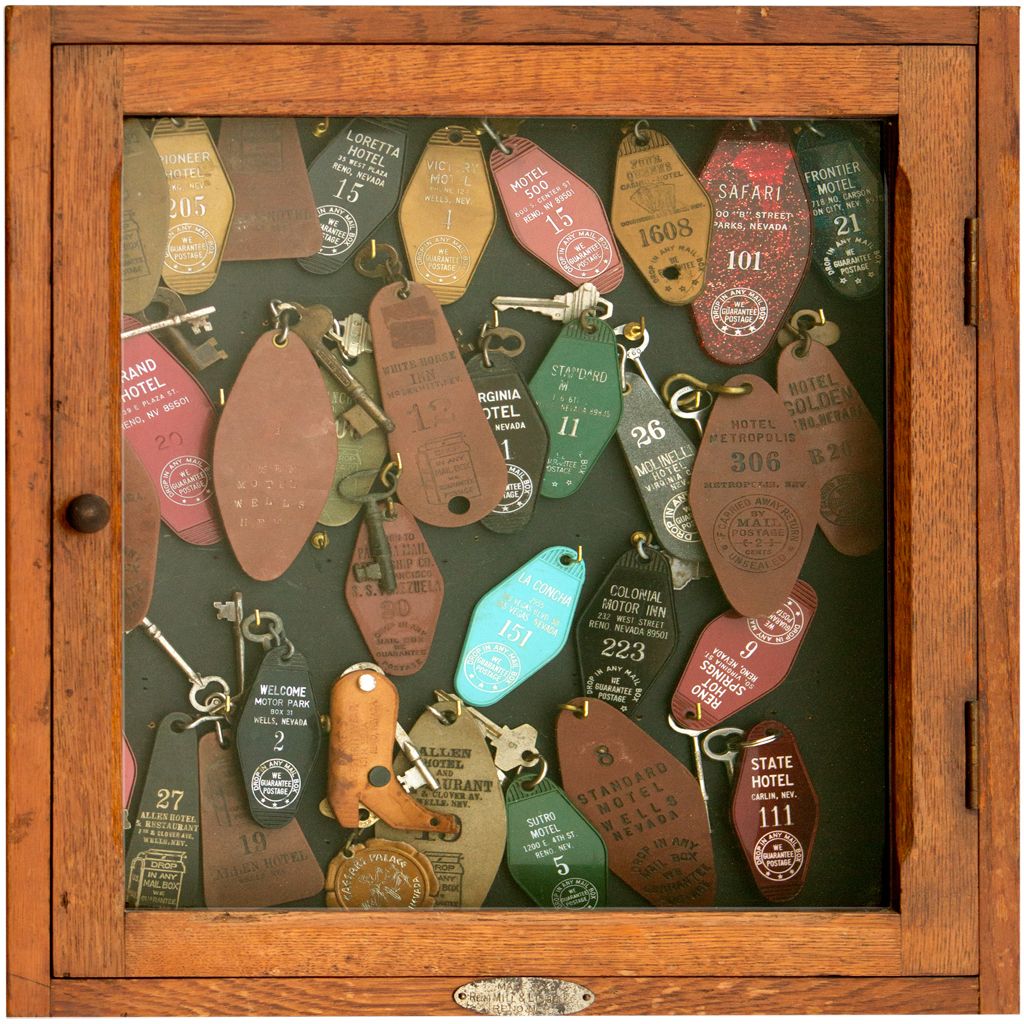 Wooden display case made by Reno Mill & Lumber Co. 17" x 19" x 2.5" containing over 25 hotel, motel, and steamship room keys. - Jacobitz Collection -60108