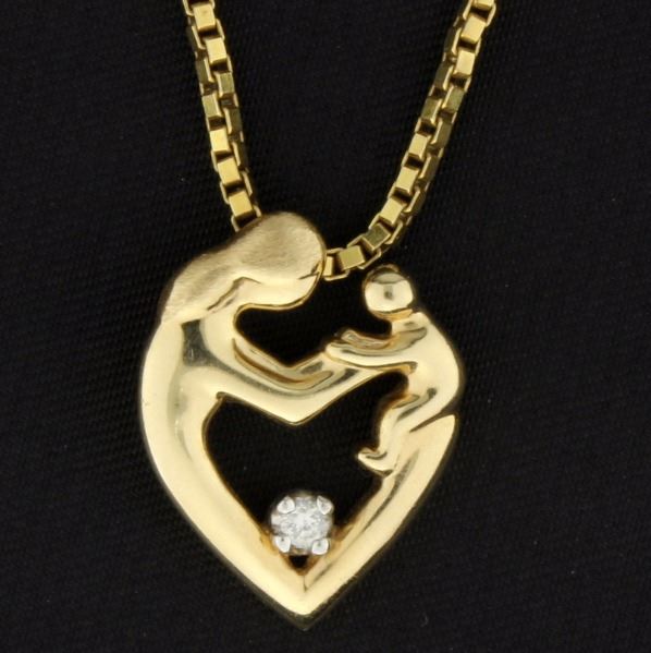 In 14K yellow gold. The pendant is 3/4 inch long and contains one .05ct round diamond, on a 19 inch box link chain-that has a lobster clasp. 8.2g
