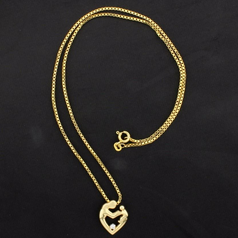 In 14K yellow gold. The pendant is 3/4 inch long and contains one .05ct round diamond, on a 19 inch box link chain-that has a lobster clasp. 8.2g