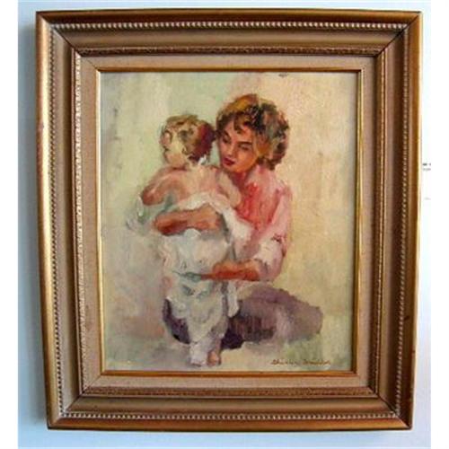 Lovely oil on board painting, impressionist style "Mother Holding Child". Very well done. Signed Shirley Bridler lower right. Extremely soft and serenely painted. Original gold painted wood frame with linen mat. Piece dates to early 1950's. Very good condition, no repairs. Frame adds an additional 3" to dimensions. Very, very nice piece!