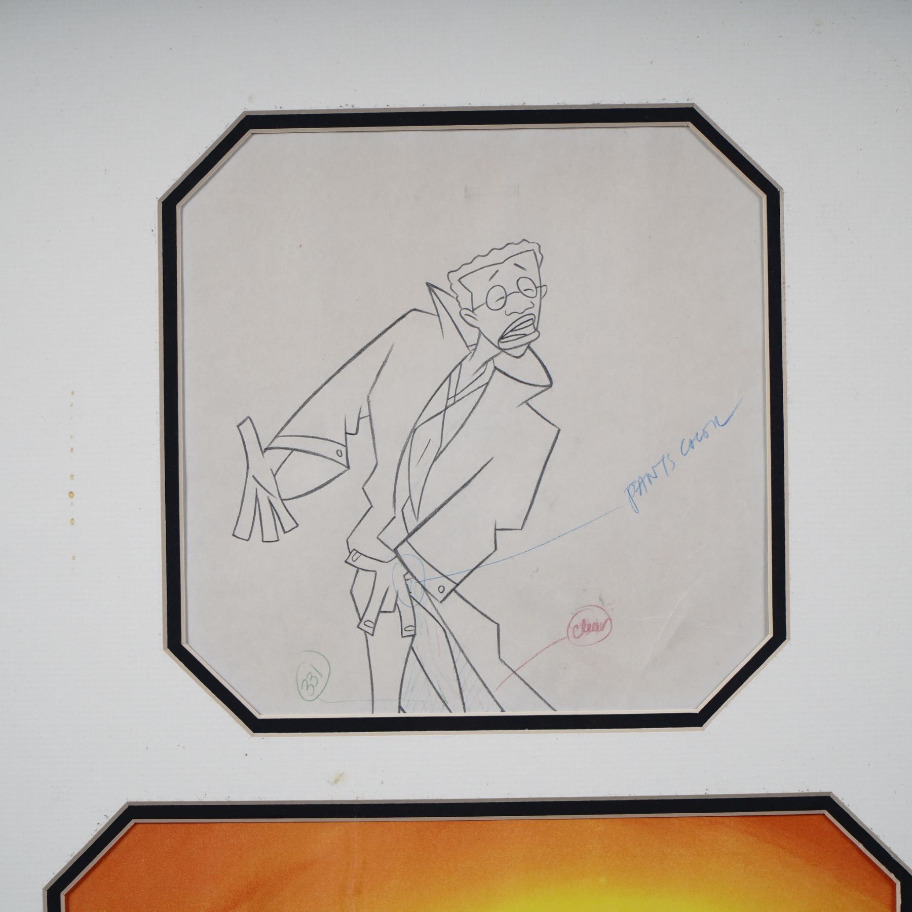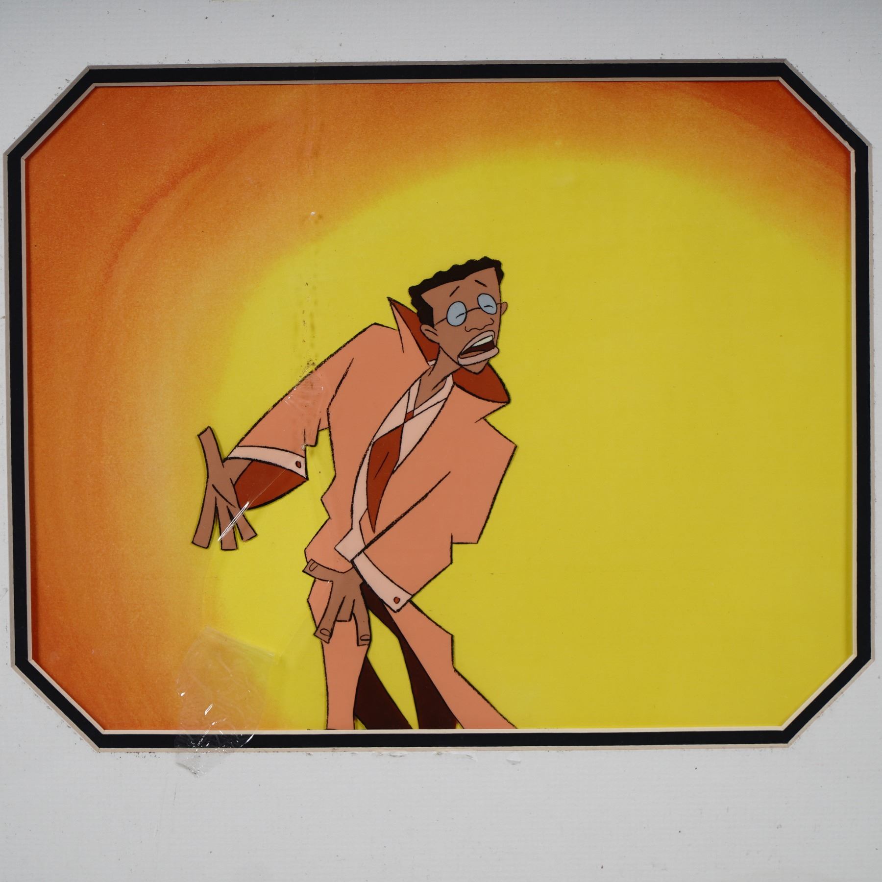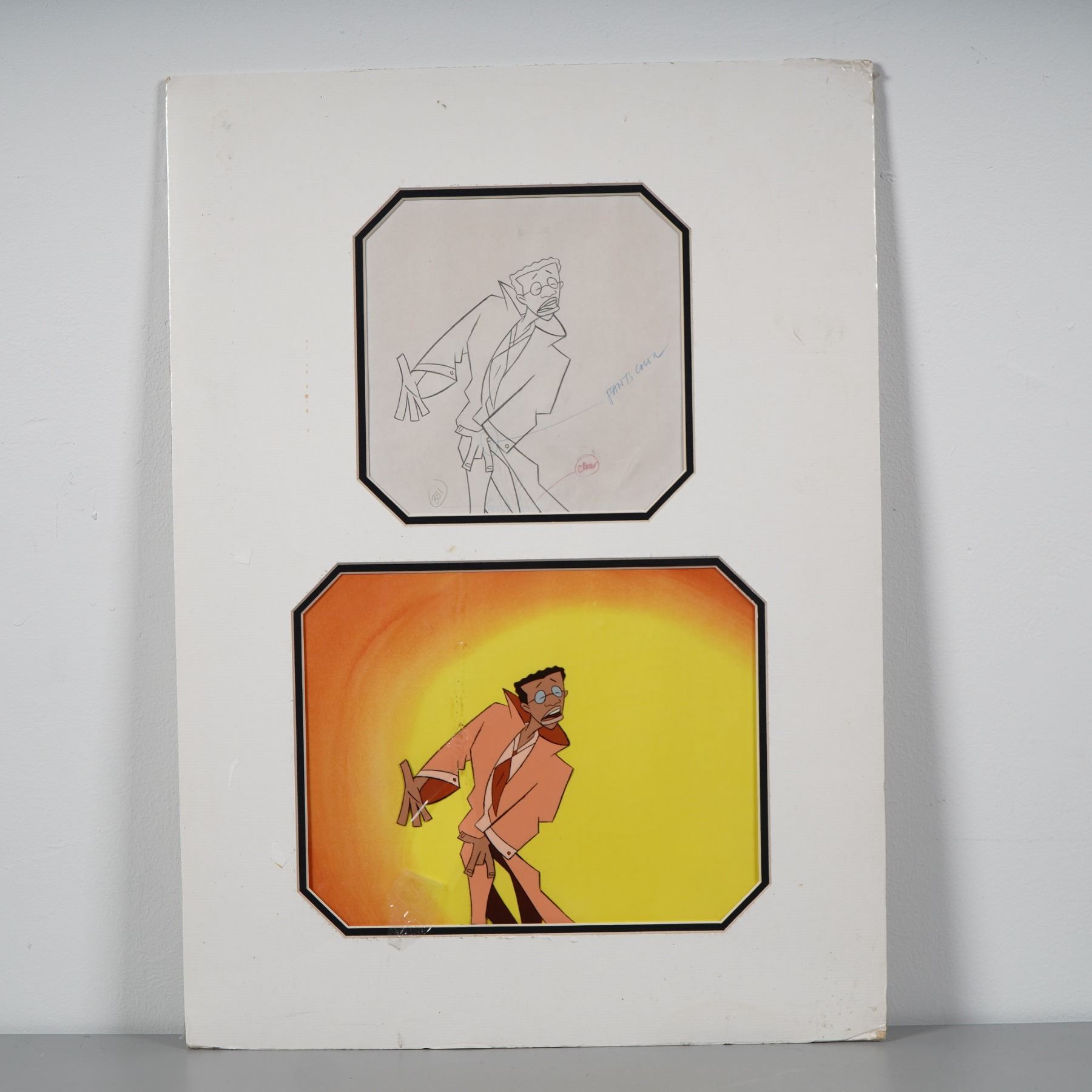 Original production animation cel paired with its corresponding hand-drawn production sketch from the HBO animated series Happily Ever After: Fairy Tales for Every Child. This piece features artwork from the Mother Goose: A Rappin and Rhymin Special, conceived and narrated by Robert Guillaume. The character depicted is based on the stylized design of Robert Guillaume's animated persona, shown in a vivid orange and yellow background with dynamic, expressive motion. The sketch includes animation notations and is mounted above the finished cel, both presented in a professionally matted format.