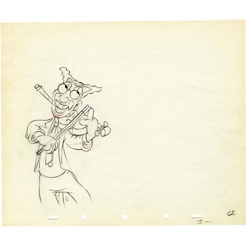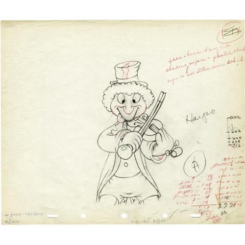 <B>"Mother Goose Goes Hollywood" Animation Production Drawing Original Art, Group of 3 (Disney, 1938).</B></I> Old King Cole summons his "Fiddlers Three," who turn out to be the Marx Brothers, in "Mother Goose Goes Hollywood." Here are three drawings featuring Groucho (OPD #12), Harpo (OPD #222), and Chico (OPD #105). Each drawing is rendered in graphite and red pencil on a 12 field sheet of animation paper (12" x 10"). Aside from some paper tanning, the pages are in Very Good condition.<BR><BR><b>Shipping:</b> Flat Material, Small (<a target="_blank" href="http://www.heritageauctions.com/common/shipping.php">view shipping information</a>)