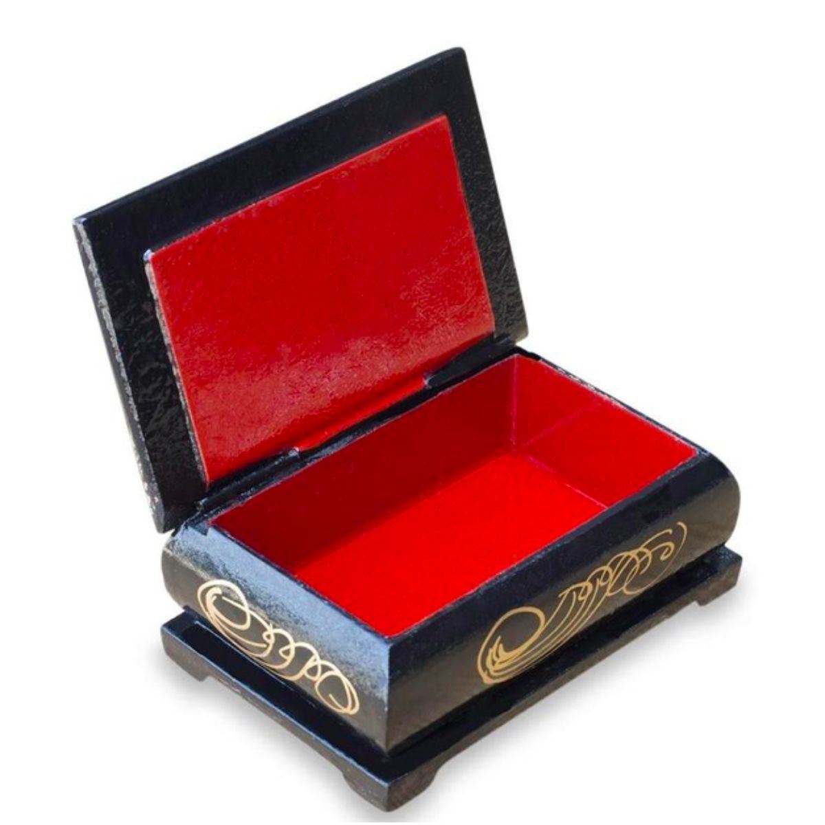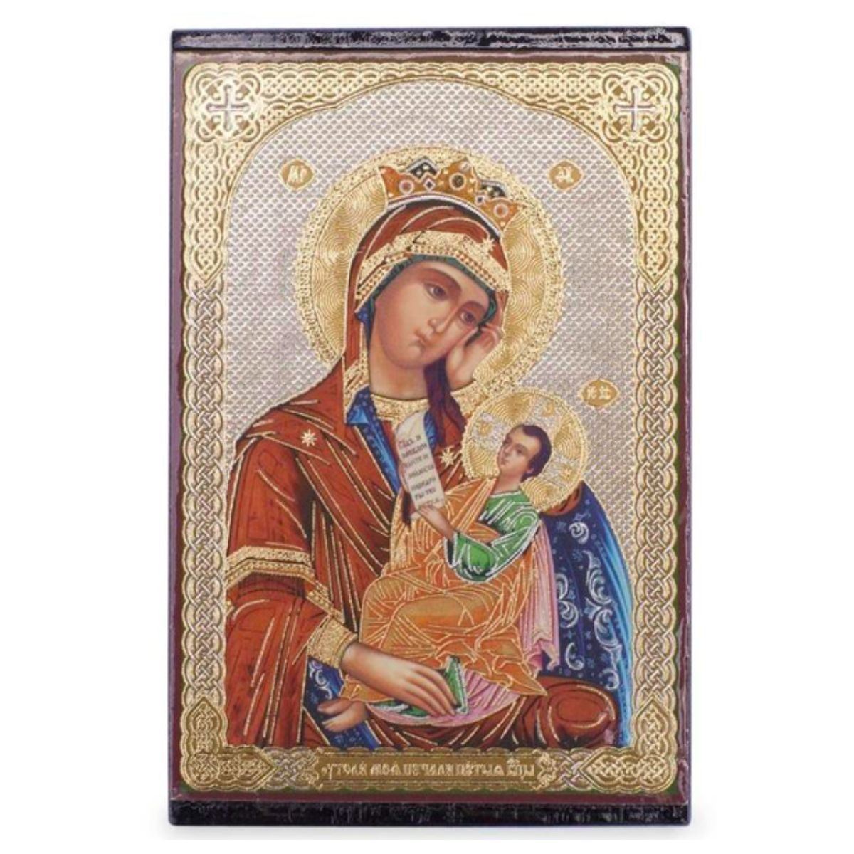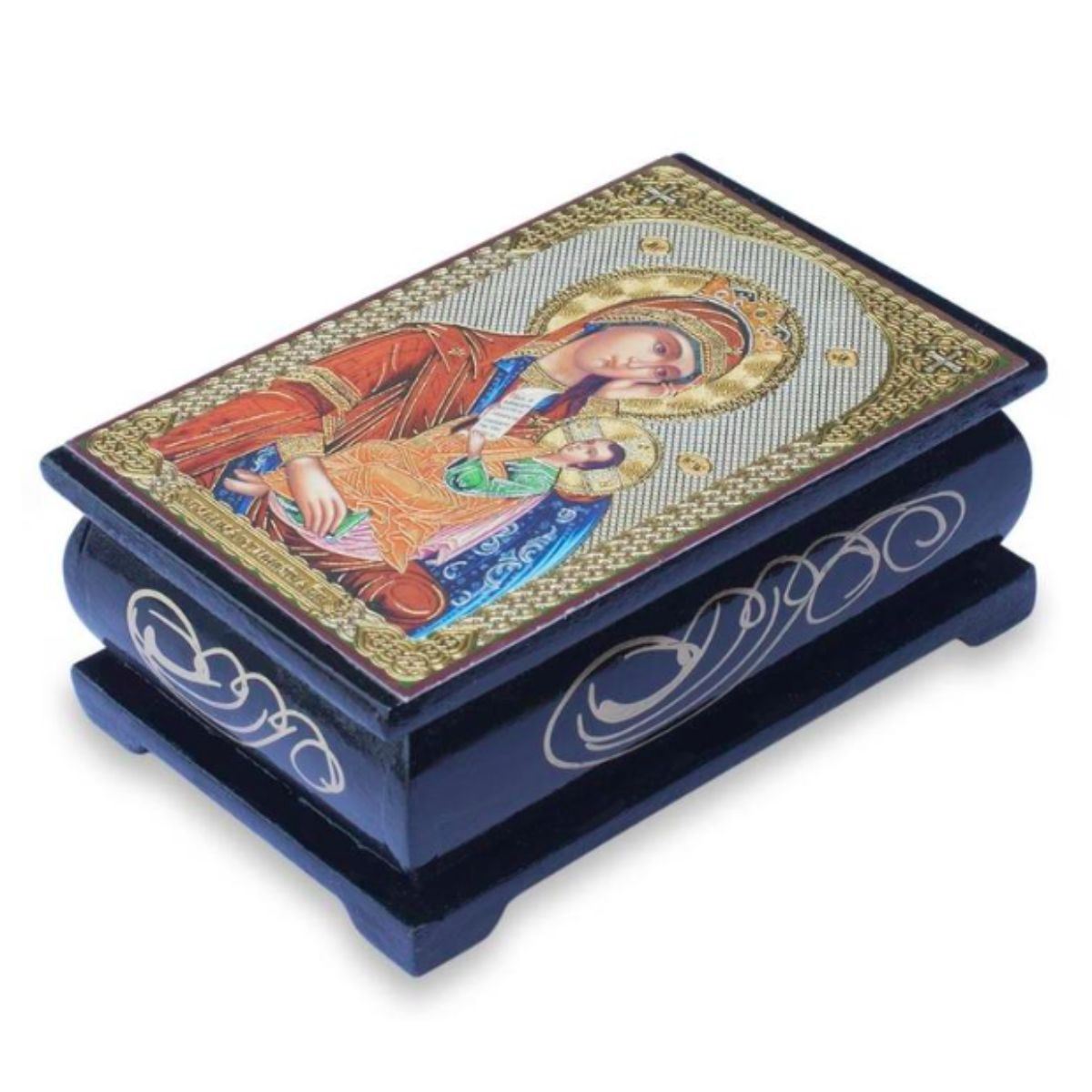 Mother Mary Holding Jesus wooden Icon decoupage trinket, rosary box with hand-painted gold accents. Handcrafted in the Czech Republic from Linden wood. 3 1/2" L X Â 2 1/4" W X 1 1/2" H.