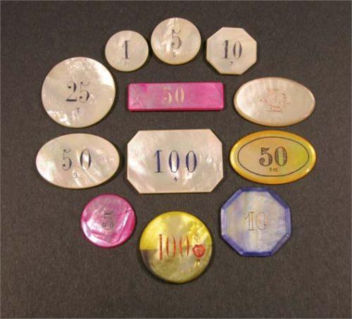 Mother of pearl chips and markers gaming set including 2-100/4-50/1-25/2-10/2-5/1-1 ex. cond.