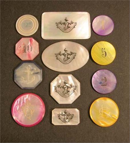 Mother of pearl chips and markers gaming set including set of 4 markers/1-25/2-20/2-10/1-5/1-2/1-1. ex. cond.