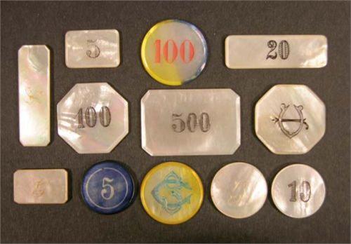 Mother of pearl chips and markers gaming set including set of 3 markers 1-500/3-100/1-50/1-20/1-10/2-5. ex. cond.