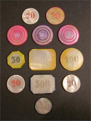 Mother of pearl chips and markers gaming set including 1 plain round/1-100/1-500/1-100/1-50/4-20/3-10. ex. Cond.