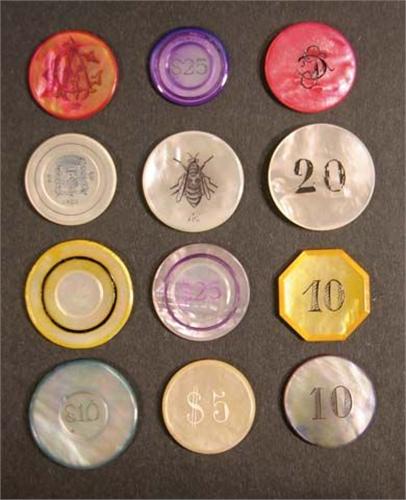 Mother of pearl chips and markers gaming set including 1-500/2-25/2-20/1 plain round/4-10/2-5. ex. cond.