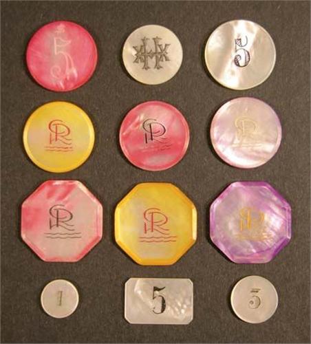 Mother of pearl chips and markers gaming set including 1 marker/6-5/3-10/1-3/1-1. ex. Cond.