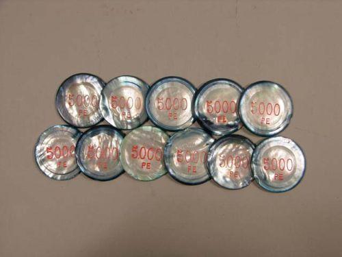 Mother of pearl gaming chips - 11 pcs. - 5000 PE blue/white with red trim. Some have chips on edges.