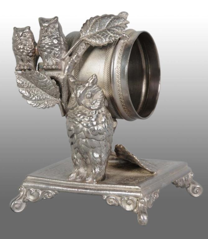 Marked "Simpson, Hall, Miller" on base and numbered "204". Depicts mother owl on base and two owlets perched in branches and leaves overhead by napkin holder on a footed square base. Condition (Very Good).