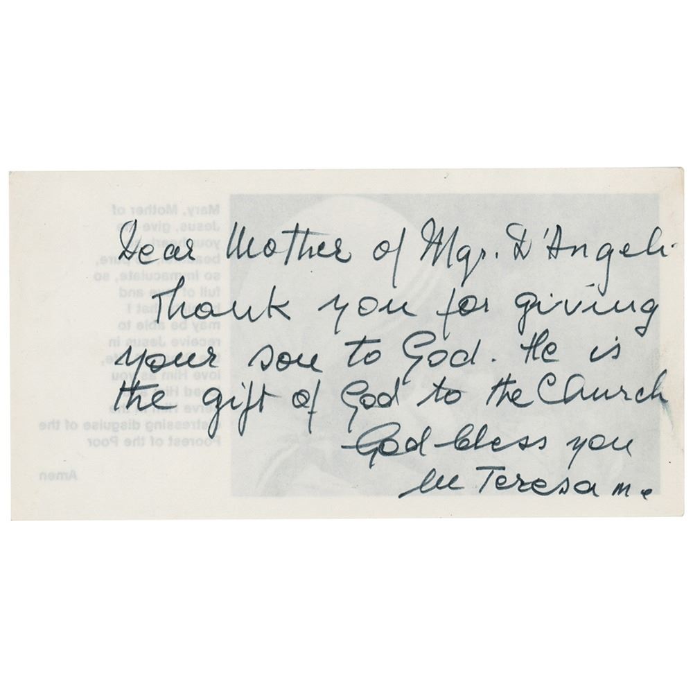 ANS signed “M Teresa mc,†one page, 6.25 x 3.25, a prayer slip letterhead, no date. Handwritten note by Mother Teresa, in full: "Dear Mother of Mgr. D'Angeli, Thank you for giving your son to God. He is the gift of God to the Church. God bless you." In fine condition. Accompanied by a full letter of authenticity from JSA. A poignant sentiment from the revered nun and missionary.