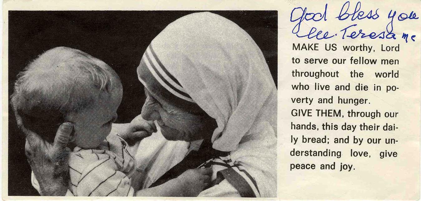 Lovely prayer card signed by Mother Teresa, showing her cradle a small child in her arms. 6'' x 3'' card signed ''God bless you / M. Teresa mc [Missionaries of Charity].'' Card reads on front, ''MAKE US worthy, Lord to serve our fellow men throughout the world who live and die in poverty and hunger. / GIVE THEM, through our hands, this day their daily bread; and by our understanding love, give peace and joy.'' A second prayer is printed on verso. Light creasing and wear; overall in very good condition.