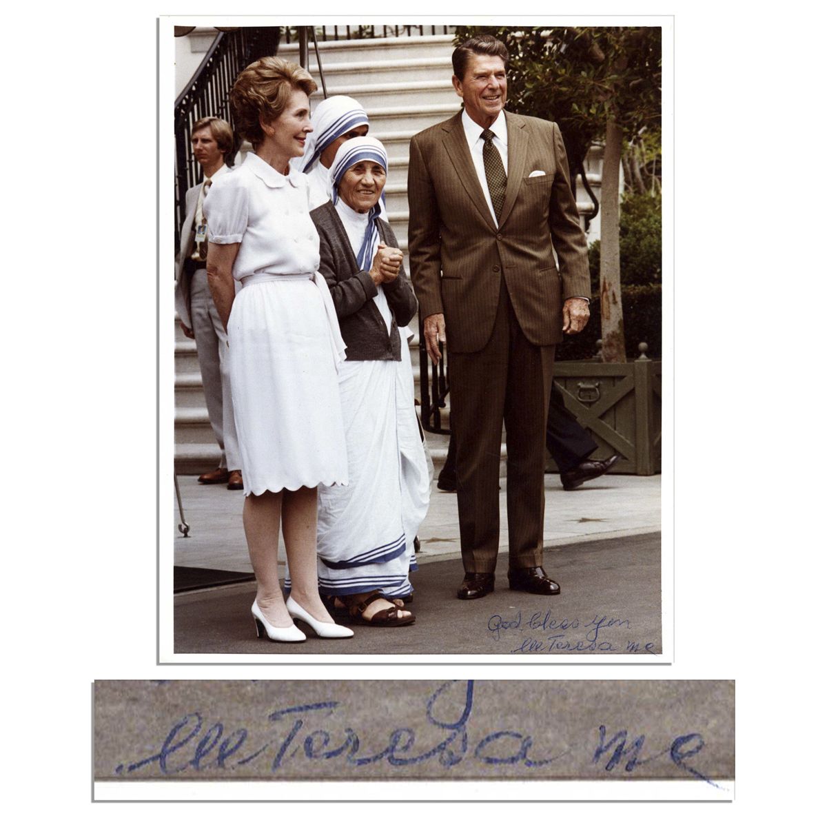 Mother Teresa signed photo, with an official White House stamp to verso dating the photo 4 July 1981. Here, Mother Teresa poses between President Reagan and Nancy Reagan at a gathering in his first year in office. Signed in blue ink along the bottom, ''God Bless You / M. Teresa mc [Missionaries of Charity].'' Half-mat color photo measures 8'' x 10'' and has very minor toning, else fine condition.