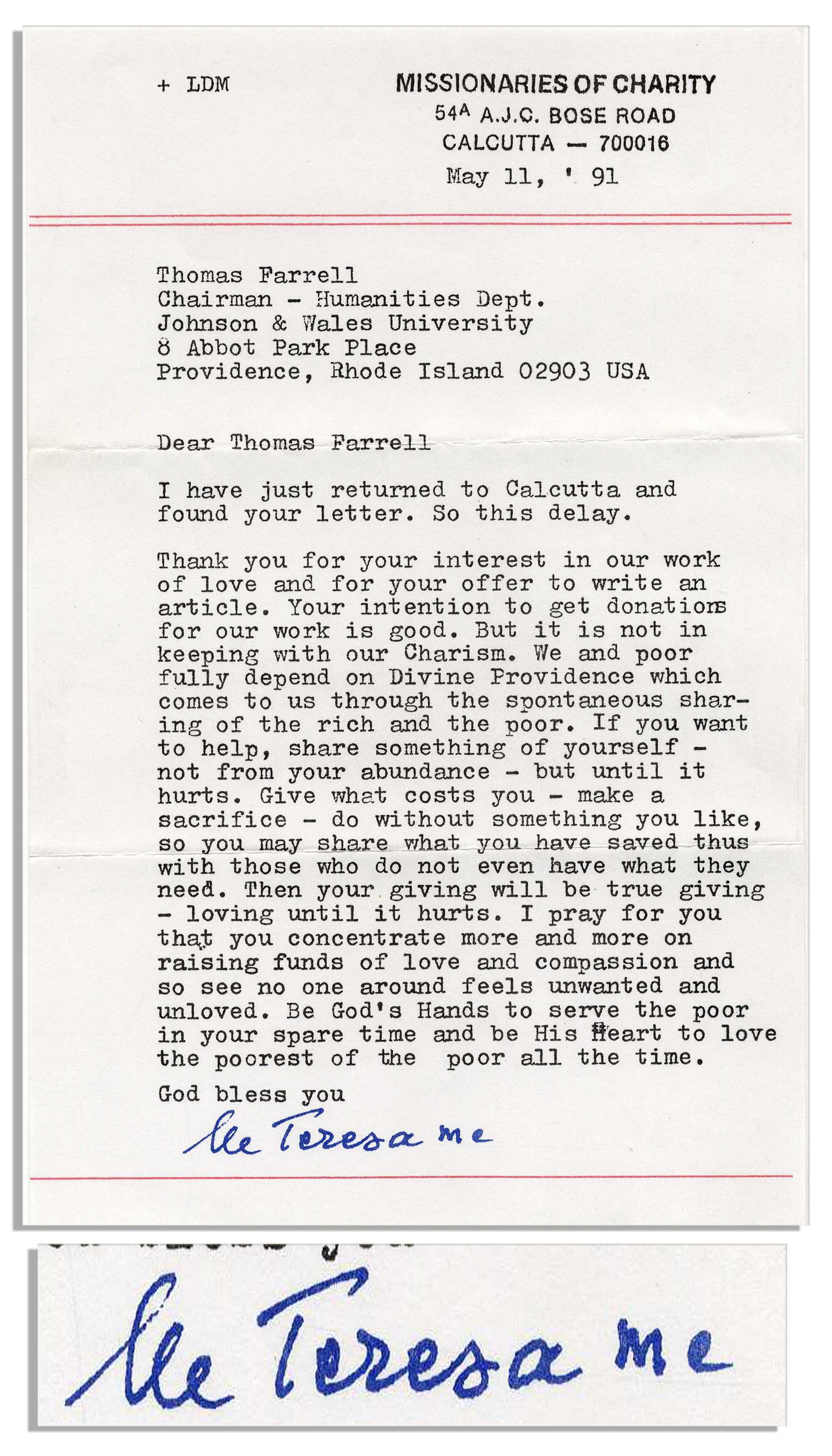 Mother Teresa typed letter signed, dated 11 May 1991, from Calcutta, India, on ''Missionaries of Charity'' letterhead. Letter reads in part: ''…Thank you for your interest in our work of love and for you offer to write an article. Your intention to get donations for our work is good. But it is not in keeping with our Charism. We and poor fully depend on Divine Providence which comes to us through the spontaneous sharing of the rich and the poor…'' Signed clearly ''M Teresa mc''. Letter measures 5.5'' x 8.5''. Near fine condition.