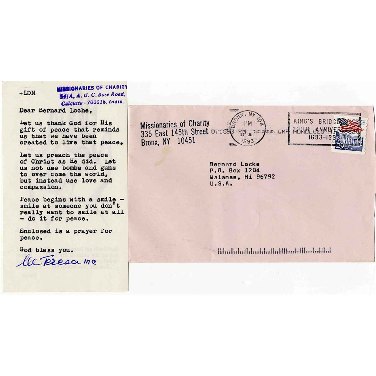 Lovely typed letter signed ''M Teresa MC [Missionaries of Charity] upon the subject of peace in the world. She writes, ''Let us thank God for His gift of peace that reminds us that we have been created to live that peace. Let us not use bombs and guns to over come the world, but instead use love and compassion. Peace begins with a smile - smile at someone you don't really want to smile at all - do it for peace.'' Page measures 3.25'' x 5.5''. Accompanied by prayer card and original mailing envelope postmarked 12 July 1993. Fine condition.
